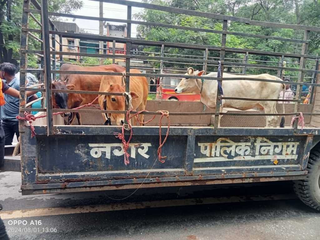 * मुख्य मार्गो, संपर्क सड़को, सार्वजनिक स्थानों से काउकेचर के माध्यम से सुरक्षित उठाये जा रहे मवेशी