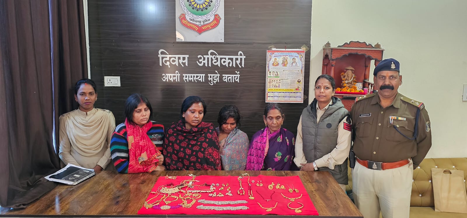 बिलासपुर (ट्रैक सिटी) दिनांक 28.01.2024 को प्रार्थी चित्रसेन सिंह निवासी राज किशोर नगर सरकण्डा ने थाना आकर रिपोर्ट दर्ज कराया कि इनके घर में पूजा कार्यक्रम चल रहा था, सुबह दो महिलायें आकर घर में साफ सफाई का काम करने के लिए काम मांगे और घर में साफ सफाई करने के दौरान बेडरूम में रखे आलमारी को खोलकर आलमारी में रखे सोने चांदी के जेवर एवं नगदी रकम 2500 रू. को चोरी कर लिए की सूचना पर थाना सरकण्डा में तत्काल अपराध पंजीबद्ध किया गया, तथा इसकी सूचना पुलिस अधीक्षक बिलासपुर संतोष कुमार सिंह (भापुसे) को दी गई, जिस पर तत्काल आरोपियों की धरपकड़ करने के निर्देश प्राप्त हुये, जिस पर अतिरिक्त पुलिस अधीक्षक (शहर) राजेन्द्र जायसवाल एवं सी.एस.पी (सरकंडा) श्रीमति पूजा कुमार के मार्ग दर्शन एवं थाना प्रभारी सरकडा निरीक्षक जय प्रकाश गुप्ता के निर्देशन में थाना सरकण्डा से एक टीम तैयार कर घटना स्थल तथा आरोपियों के भागने के रास्ते एवं सरहदी क्षेत्र की ओर रवाना किया गया टीम द्वारा पतासाजी के दौरान जयराम नगर रेल्वे स्टेशन के पास दबिश दिये स्टेशन के पास कुछ महिलायें पुलिस टीम को देखकर भागने लगे जिसे टीम के द्वारा महिला स्टाफ के मदद से घेराबंदी कर 4 महिलाओं को पकड़ा गया, नाम पता पूछने पर पुलिस को गुमराह करते रहे, जिन्हें चेक करने पर सभी चारो महिलाओ के पास से चोरी गये सोने एवं चांदी के आभूषण जिसमें गले का हार 5 नग, कान के झूमके 5 नग, 2 अंगूठी, पायल 1 नग, सहित कुल किमती लगभग 9 लाख रूपये को जप्त किया गया, सभी महिला आरोपियों को गिरफ्तार कर रिमाण्ड पर माननीय न्यायालय पेश किया गया।