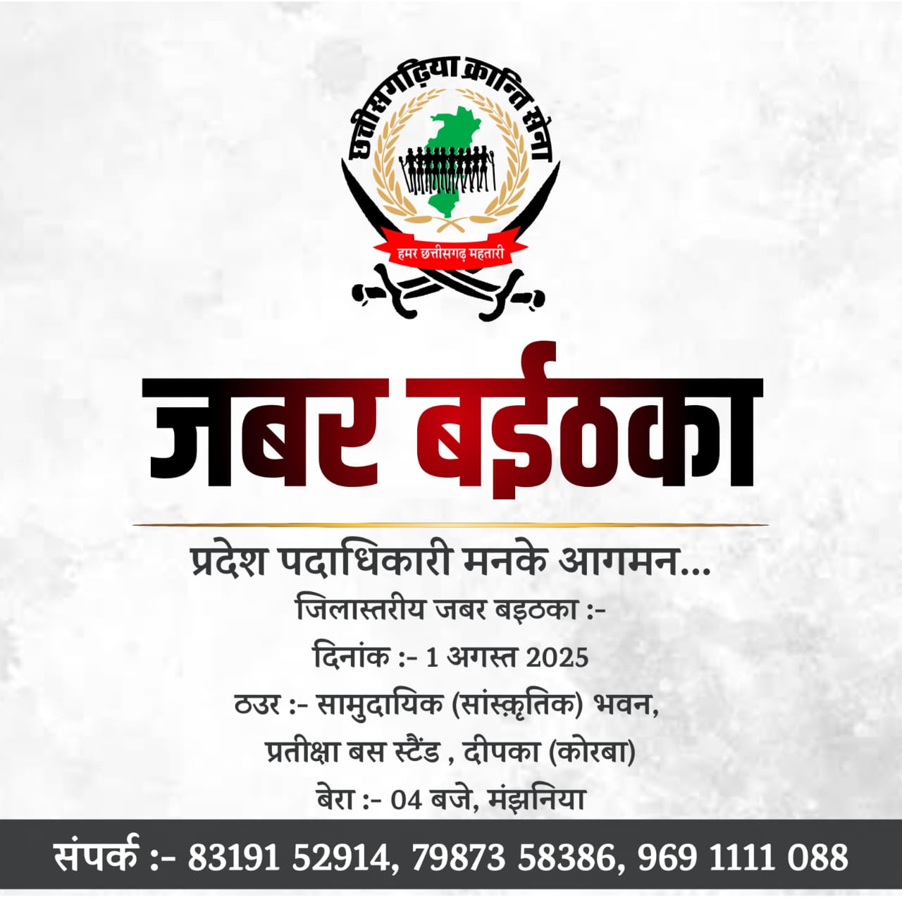 छत्तीसगढिया क्रान्ति सेना के संगठन विस्तार को लेकर बड़ी बैठक आज दिनाँक 01/08/2025 को जांजगीर शहर में सुबह 11 बजे आहूत की गई है जहाँ सैकड़ो छत्तीसगढिया समाज के लोग आज छत्तीसगढिया क्रान्ति सेना की सदस्यता लेंगे तत्पश्चात कोरबा के दीपका छेत्र में संगठन की जिला स्तरीय बड़ी बैठक होनी है जहां आगामी प्रदेशस्तरीय भोजली रैली को जोरदार सफल बनाने कार्ययोजना बनाई जाएगी साथ ही जिले में संगठन की मजबूती और संगठन विस्तार विषय को लेकर बड़ी रणनीति बनाई जाएगी । जांजगीर और कोरबा जिले के छत्तीसगढ़िया समाज को आज के इस बैठक में शामिल होकर संगठन के रीति नीति को समझने का अवसर मिलेगा इस अवसर पर मुख्य रूप से छत्तीसगढिया क्रान्ति सेना के प्रदेश अध्यक्ष डॉ अजय यादव जी एवं जोहार छत्तीसगढ़ पार्टी के केन्द्रीय अध्यक्ष अमित बघेल जी से मिलकर सेनानी अपनी बात रख सकेंगे ।