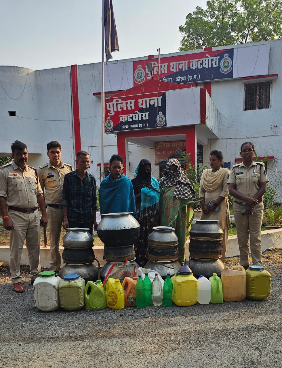 इसी क्रम में कटघोरा थाना क्षेत्र के वार्ड क्रमांक 5, बिंझवार मोहल्ला में की गई, जहां चार अलग-अलग स्थानों पर दबिश दी गई। पुलिस टीम को मौके पर भारी मात्रा में अवैध कच्ची महुआ शराब और लाहन बरामद हुई। छापे के दौरान कुल 70 लीटर कच्ची महुआ शराब और 10 क्विंटल महुआ लाहन जब्त की गई, जिसे बाद में मौके पर ही नष्ट कर दिया गया। इसके साथ ही शराब निर्माण में उपयोग होने वाले भट्ठी और बर्तन भी पुलिस द्वारा ज़ब्त किए गए।