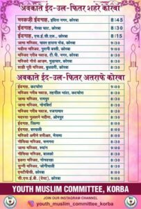 बता दे की आज सऊदी अरब में ईद की नमाज की जा चुकी है मामूल यही रहा है कि सऊदी अरब में ईद की नमाज होने के दूसरे दिन हिंदुस्तान में ईद की नमाज पढ़ी जाती है लेकिन चांद का दिखना खास मायने रखता है अगर कल 31 मार्च को या 1 अप्रैल को ईद की नमाज पढ़ी जाती है तो कोरबा जिले के एतराज की मस्जिदों और ईदगाहों में नमाज का टाइम टेबल निम्नलिखित होगा.
