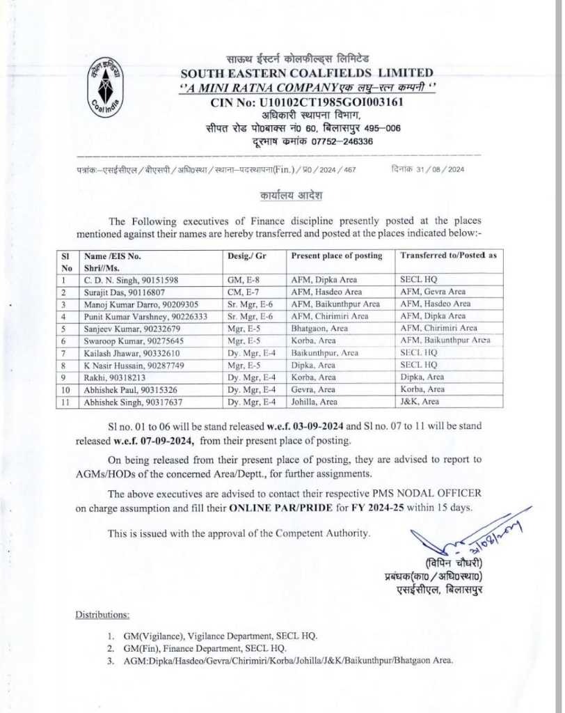 जानकारी के अनुसार एसईसीएल मुख्यालय बिलासपुर के कार्मिक प्रबंधक विपिन चौधरी ने 11 अधिकारीयों का तबादला आदेश जारी किया है। जारी आदेश में गेवरा एरिया के सहायक महाप्रबंधक अभिषेक पॉल को कोरबा एरिया में पदस्थ किया गया है। इसी तरह दीपका एरिया के नासिर हुसैन को एसईसीएल मुख्यालय में भेजा गया है। दीपका एरिया के सी.डी.एन सिंह को मुख्यालय पदस्थ किया गया है।