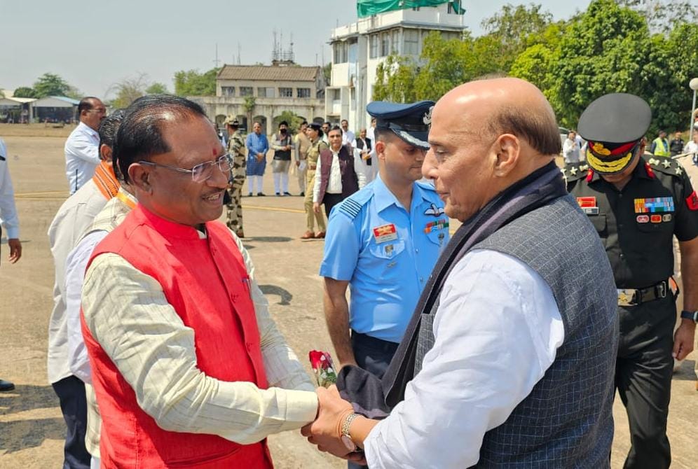 केंद्रीय रक्षा मंत्री राजनाथ सिंह के स्वामी विवेकानंद एयरपोर्ट माना पहुंचने पर मुख्यमंत्री विष्णुदेव साय ने किया आत्मीय स्वागत