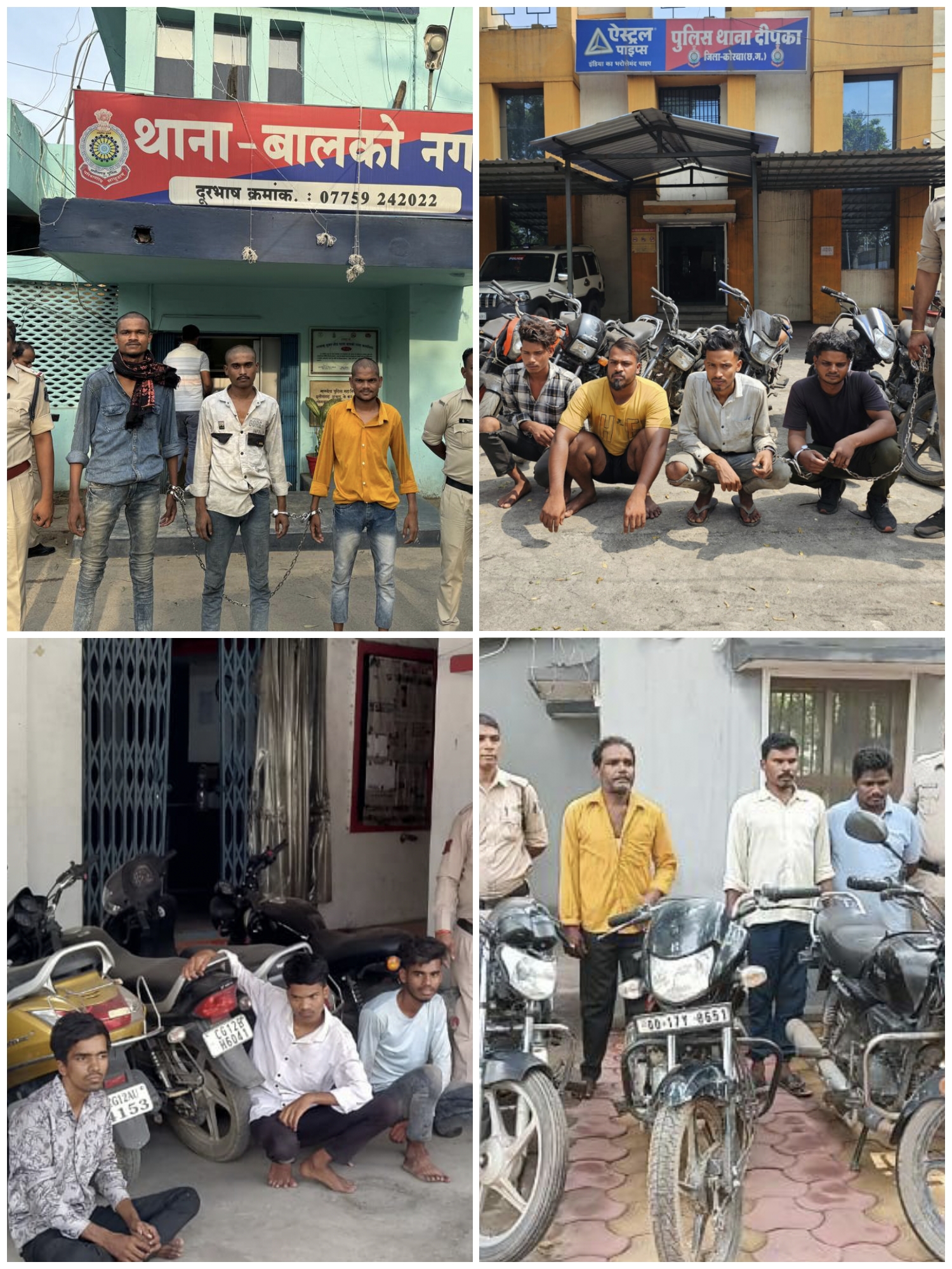 कोरबा (ट्रैक सिटी) पुलिस अधीक्षक कोरबा सिद्धार्थ तिवारी (भा.पु.से.) द्वारा अवैध गतिविधियों एवं असामाजिक तत्वों के विरुद्ध कठोर कार्यवाही करने के निर्देश सभी थाना प्रभारियों को दिया गया है, उक्त निर्देश पर अतिरिक्त पुलिस अधीक्षक यूबीएस चौहान, नगर पुलिस अधीक्षक कोरबा रविन्द्र कुमार मीना (भा.पु.से.) और नगर पुलिस अधीक्षक श्रीमती प्रतिभा मरकाम के मार्गदर्शन में थाना/चौकी प्रभारियों के नेतृत्व में मोटरसाइकिल चोरी करने वाले अंतर्राज्यीय गिरोह को पकड़ने में सफलता प्राप्त हुई है। प्रार्थियों की रिपोर्ट पर थाना दीपका, बालको, चौकी सीएसईबी व चौकी मानिकपुर में रिपोर्ट दर्ज कराया गया था कि जिले के विभिन्न स्थानों से मोटर सायकल की अज्ञात व्यक्तियों के द्वारा चोरी कर लिया गया था जिस पर संबंधित थाना/चौकी में अपराध पंजीबद्ध कर वरिष्ठ अधिकारियों के मार्गदर्शन में तत्काल थाना बालको, थाना दीपका, चौकी सीएसईबी एवं चौकी मानिकपुर के द्वारा टीम गठित कर मोटरसाइकिल चोरी करने वाले अंतर्राज्यीय गिरोह के कुल 18 आरोपी एवं 04 अपचारी बालक को पकड़कर उनके कब्जे से चोरी किए गए विभिन्न माडल जैसे बूलेट, होण्डा एक्टिवा, स्पलेंडर, डिलक्स एवं अन्य कंपीनियों के कुल 21 नग मोटर सायकल एवं घरेलू सामान के साथ उड़ीसा पासिंग नंबर प्लेट को जप्त किया गया।
