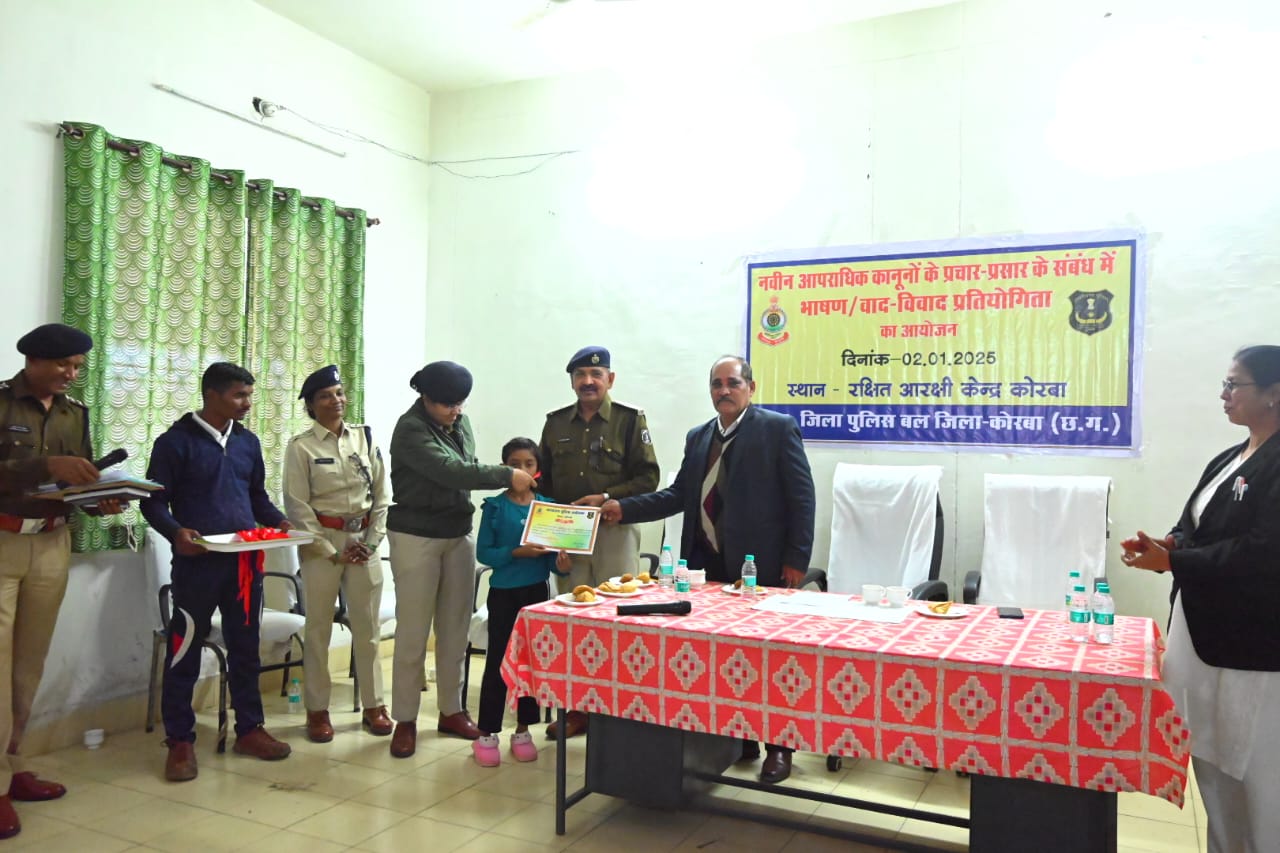कोरबा (ट्रैक सिटी)/ कोरबा पुलिस द्वारा भारतीय न्याय संहिता, भारतीय नागरिक सुरक्षा संहिता और भारतीय साक्ष्य अधिनियम के बारे में प्रचार-प्रसार से संबंधित भाषण/वाद-विवाद प्रतियोगिता का आयोजन रक्षित आरक्षी केंद्र कोरबा में आयोजन किया गया।
