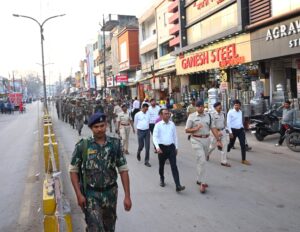 गुंडे तथा असामाजिक तत्वों को हतोत्साहित और जन सामान्य में सुरक्षा का बोध कराने प्रशासन व पुलिस की संयुक्त टीम द्वारा थाना कोतवाली से लेकर शहर के मुख्य चौक चौराहे से होते हुए कोसाबाड़ी तक फ्लैग मार्च निकला गया। जिसमें जिला प्रशासन और पुलिस के तरफ से कुल 200 से अधिक अधिकारी एवं कर्मचारीयों ने हिस्सा लिया ।