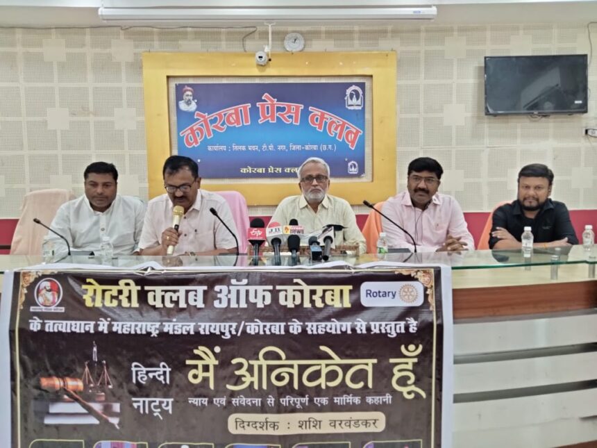कोरबा (ट्रैक सिटी)/ औद्योगिक नगरी कोरबा में एक बार फिर रंगमंच की रौनक लौटने जा रही है। रोटरी क्लब कोरबा और महाराष्ट्र मंडल कोरबा के संयुक्त तत्वावधान में 21 मार्च 2026 (शनिवार) को सुप्रसिद्ध हिंदी नाटक “मैं अनिकेत हूँ” का मंचन किया जाएगा। यह प्रस्तुति शाम 7 बजे राजीव गांधी ऑडिटोरियम (इंदिरा गांधी स्टेडियम) में आयोजित होगी। इसकी जानकारी आज कोरबा प्रेस क्लब में आयोजित प्रेस वार्ता में दी गई।
