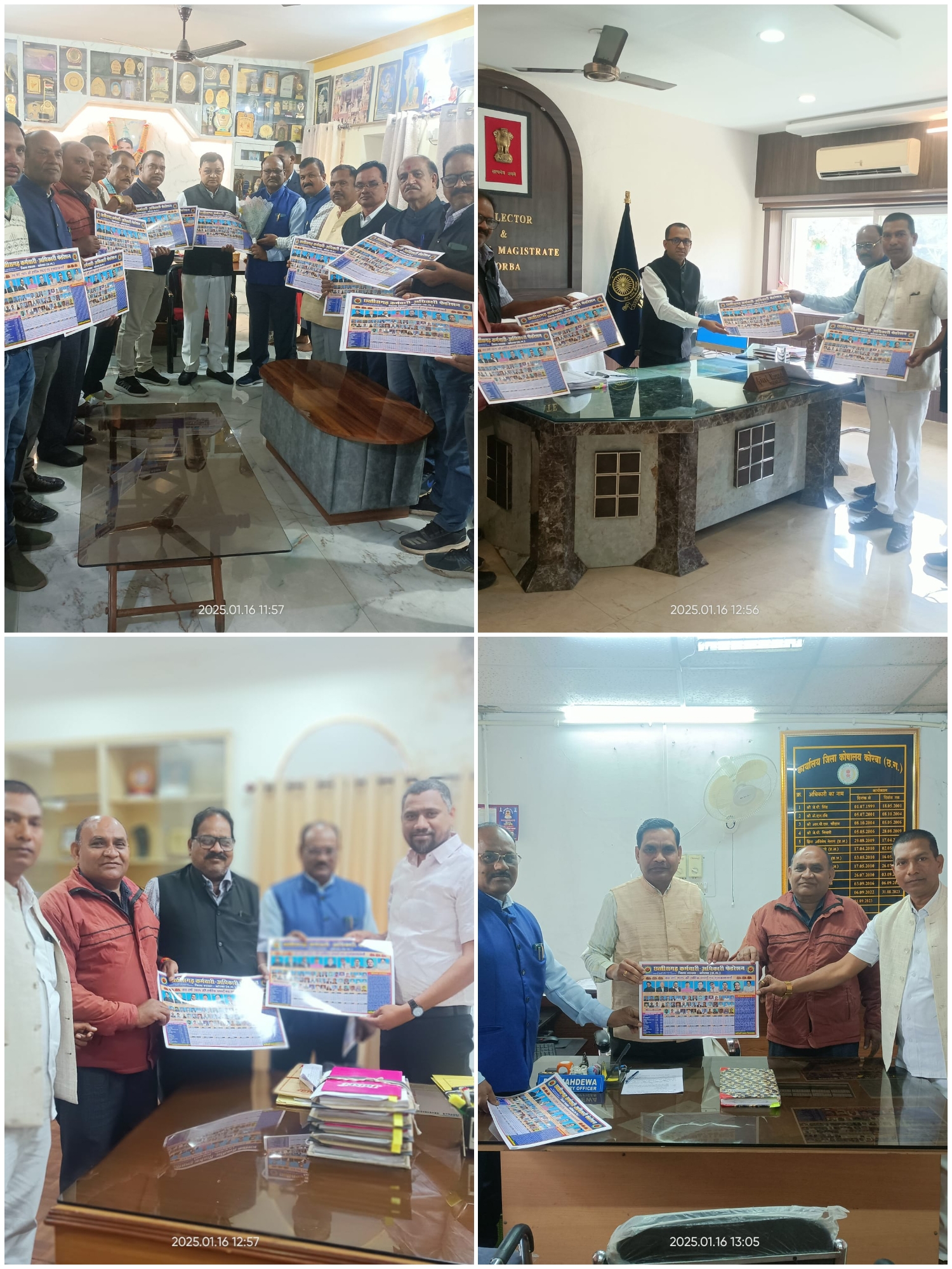 कोरबा (ट्रैक सिटी) छत्तीसगढ़ कर्मचारी अधिकारी फेडरेशन की पदाधिकारी की उपस्थिति में प्रत्येक वर्ष की भांति इस नव वर्ष में भी छत्तीसगढ़ कर्मचारी अधिकारी फेडरेशन का वार्षिक कैलेंडर 2025 का विमोचन छत्तीसगढ़ शासन केउद्योग वाणिज्य एवं कर मंत्री माननीय लखन लाल जी देवांगन के कर कमलों से उनके निज निवास में हुआ। फेडरेशन के पदाधिकारियों द्वारा गुलदस्ता एवं बुके भेंटकर नूतन वर्ष 2025 की हार्दिक बधाई एवं शुभकामनाएं प्रदान की गई। माननीय मंत्री जी द्वारा उपस्थित पदाधिकारियों को भी बधाई देते हुए छत्तीसगढ़ कर्मचारी अधिकारी फेडरेशन के जिर्णशीर्ण कार्यालय भवन की जीर्णोद्धार की स्थिति पर संज्ञान लेते हुए पूछा की मरम्मत का कार्य प्रारंभ हुआ या नहीं, पदाधिकारी ने बताया कि कार्य अभी प्रारंभ नहीं किए गए हैं। फ़ेडरेशन के वार्षिक कैलेंडर का विमोचन पश्चात् जिला प्रशासन के मुखिया अजीत बसंत (IAS) अपर कलेक्टर मनोज कुमार बंजारे, सहायक आयुक्त आदिवासी विकास श्रीकांत कसेर तथा जिला कोषालय अधिकारी पी. आर.महादेवा को भी नूतन वर्ष की मंगल कामनाएं प्रदान करते हुए वार्षिक कैलेंडर भेंट किया गया। आज के कैलेंडर विमोचन कार्यक्रम में मुख्य रूप से छत्तीसगढ़ कर्मचारी अधिकारी फेडरेशन के संयोजक के. आर. डहरिया, कार्यकारी संयोजक जगदीश खरे, वरिष्ठ संरक्षक प्यारेलाल चौधरी, एस. के. द्विवेदी, आर. के. पाण्डेय, महासचिवद्वय तरुण सिंह राठौड़, एस. एन. शिव जिला प्रवक्ता ओमप्रकाश बघेल, छत्तीसगढ़ अजाक्स संघ के जिला अध्यक्ष के. डी. पात्रे, आर. डी केशकर छत्तीसगढ़ प्रदेश संयुक्त शिक्षक संघ के जिला अध्यक्ष नित्यानंद यादव, छत्तीसगढ़ अपाक्स संघ के जिला अध्यक्ष नरेंद्र श्रीवास, छत्तीसगढ़ प्रदेश तृतीय वर्ग शासकीय कर्मचारी संघ के जिला उपाध्यक्ष टी. आर. कुर्रे एवं छत्तीसगढ़ कर्मचारी अधिकारी फेडरेशन के विभिन्न सम्बद्ध संगठनों केअनेक पदाधिकारी उपस्थित रहे।