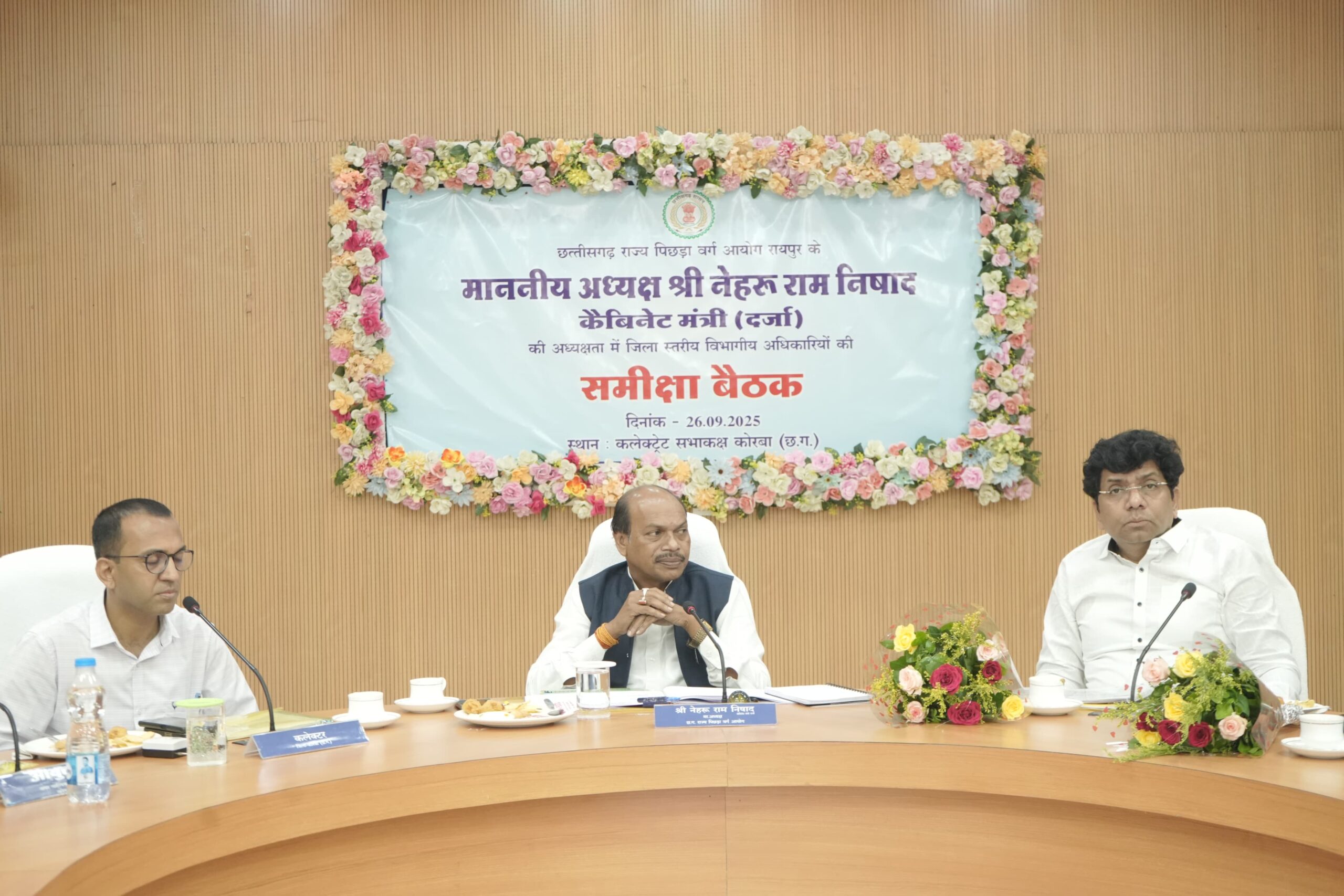 कोरबा (ट्रैक सिटी)/ छत्तीसगढ़ राज्य पिछड़ा वर्ग आयोग के अध्यक्ष नेहरू राम निषाद की अध्यक्षता में आज कलेक्टोरेट सभाकक्ष में जिला स्तरीय अधिकारियों की समीक्षा बैठक आयोजित हुई। अध्यक्ष निषाद ने अधिकारियों से जिले में अन्य पिछड़ा वर्ग के कल्याण हेतु संचालित केंद्र एवं राज्य सरकार की विभिन्न योजनाओं की प्रगति की जानकारी ली और योजनाओं का धरातल पर बेहतर क्रियान्वयन कर समाज के अंतिम पायदान में खड़े व्यक्ति तक लाभ पहुचाने के निर्देश दिए। इस दौरान कलेक्टर अजीत वसंत, निगम आयुक्त आशुतोष पाण्डेय, मुख्य कार्यपालन अधिकारी जिला पंचायत दिनेश नाग, सहायक कलेक्टर क्षितिज गुरभेले, अपर कलेक्टर देवेंद्र पटेल, सचिव राज्य पिछड़ा वर्ग आयोग संकल्प साहू, सहायक अनुसंधान अधिकारी श्रीमती अनिता डेकाटे, सहायक आयुक्त आदिवासी विभाग श्रीकांत कसेर सहित विभागीय अधिकारी उपस्थित थे।