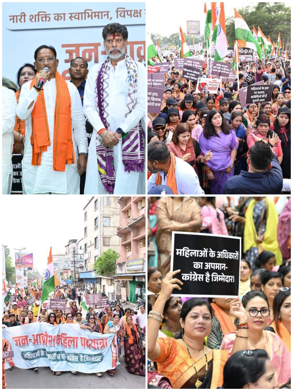 कार्यक्रम का संचालन महासमुंद सांसद रूपकुमारी चौधरी ने किया एवं आभार प्रदर्शन महिला मोर्चा की प्रदेश अध्यक्ष विभा अवस्थी ने किया। जन आक्रोश पदयात्रा सुभाष स्टेडियम में संपन्न हुई। जन आक्रोश यात्रा में केंद्रीय राज्य मंत्री तोखन साहू, प्रदेश महामंत्री यशवंत जैन, अखिलेश सोनी, डॉ. नवीन मार्कण्डेय, कैबिनेट मंत्री लक्ष्मी राजवाड़े, केदार कश्यप, लखनलाल देवांगन, राजेश अग्रवाल, गुरु खुशवंत साहेब, सांसद लक्ष्मी वर्मा, कमलेश जांगड़े, पूर्व मंत्री एवं विधायक अजय चंद्राकर, विधायक धरमलाल कौशिक, राजेश मूणत, सुनील सोनी, पुरंदर मिश्रा, पुन्नू लाल मोहले, अनुज शर्मा, ईश्वर साहू, इंद्र कुमार साहू, रायपुर शहर जिला अध्यक्ष रमेश सिंह ठाकुर, प्रदेश मंत्री हर्षिता पांडेय, हस्त शिल्प विकास बोर्ड अध्यक्ष शालिनी राजपूत, महिला मोर्चा जिला अध्यक्ष कृतिका जैन, प्रदेश प्रवक्ता शताब्दी पांडेय, डॉ किरण बघेल, सहित बड़ी संख्या में भाजपा पदाधिकारी, कार्यकर्ता सहित विभिन्न सामाजिक संगठनों से जुड़ी बहनें शामिल हुईं।