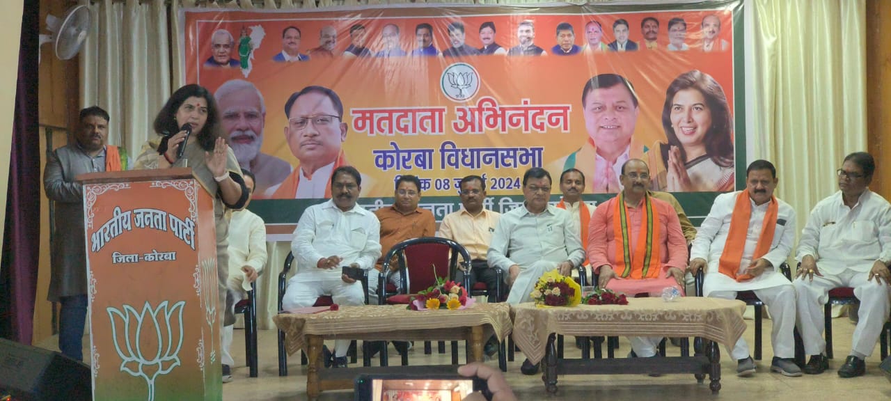 कोरबा (ट्रैक सिटी) देश मे तीसरी बार मोदी जी के नेतृत्व् मे सरकार और राज्य मे विष्णु देव साय के नेतृत्व मे भाजपा सरकार बनने पर मतदाताओं को धन्यवाद सम्मान समारोह का आयोजन आज सुश्री सरोज पांडेय राष्ट्रीय उपाध्यक्ष भाजपा के मुख्य आतिथ्य में संपन्न हुआ।