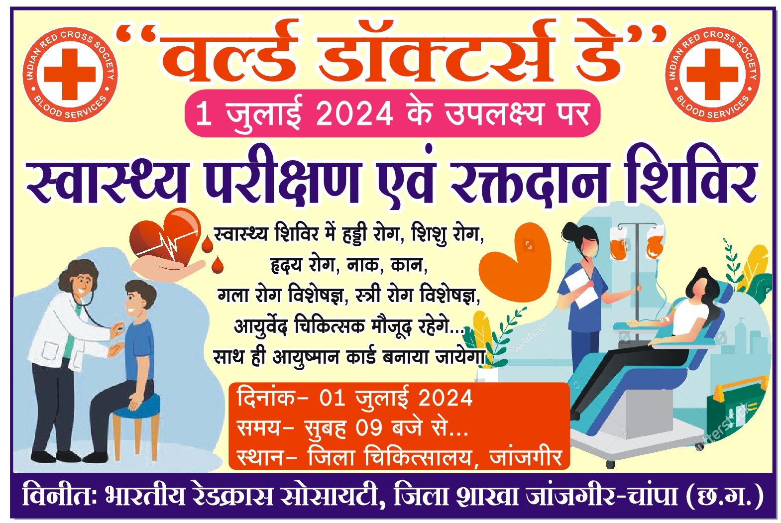 जांजगीर-चांपा/ कलेक्टर एवं जिला रेडक्रॉस सोसयटी जांजगीर-चांपा के अध्यक्ष आकाश छिकारा के निर्देशन में 1 जुलाई 2024 को “वर्ल्ड डॉक्टर्स डे” (विश्व चिकित्सक दिवस) के उपलक्ष्य पर जिला चिकित्सालय जांजगीर में स्वास्थ्य परीक्षण एवं रक्तदान शिविर का आयोजन किया जाएगा।