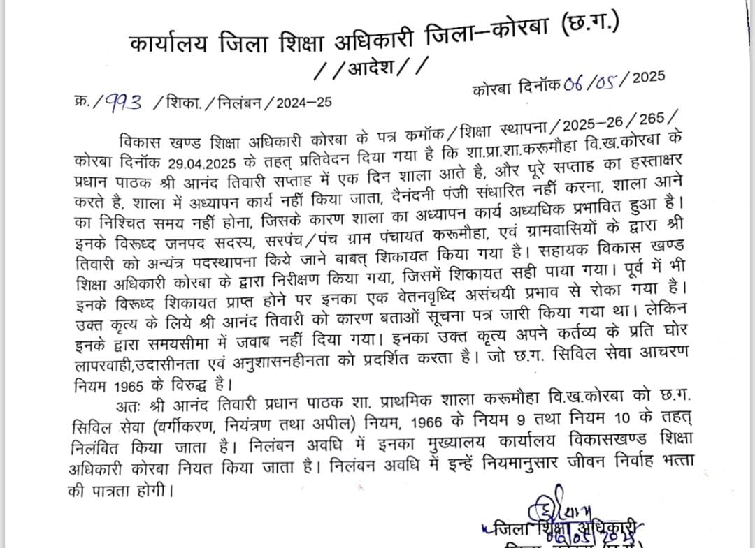 जानकारी के अनुसार विकास खण्ड शिक्षा अधिकारी कोरबा के पत्र क्रमांक/शिक्षा स्थापना/2025-26/265/कोरबा दिनॉक 29.04.2025 के तहत् प्रतिवेदन दिया गया है कि शा.प्रा.शा. करूमौहा वि.ख. कोरबा के प्रधान पाठक सप्ताह में एक दिन शाला आते है, और पूरे सप्ताह का हस्ताक्षर करते है। आरोप हैं की शाला में अध्यापन कार्य नहीं किया जाता, दैनंदनी पंजी संधारित नहीं करना, शाला आने का निश्चित समय नहीं होना आदि के कारण शाला का अध्यापन कार्य अध्यधिक प्रभावित हुआ है। इनके विरुद्ध जनपद सदस्य, सरपंच/पंच ग्राम पंचायत करूमौहा, एवं ग्रामवासियों के द्वारा अन्यंत्र पदस्थापना किये जाने बाबत् शिकायत की गयी हैं।