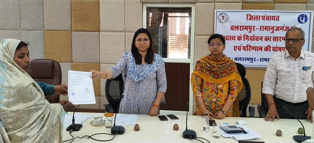 बलरामपुर/ त्रिस्तरीय पंचायत चुनाव के पहले चरण में जनपद पंचायत बलरामपुर में 20 फरवरी को मतदान संपन्न हुआ। जिसके तहत जिला पंचायत सदस्य हेतु हुए मतदान के लिए आज संयुक्त जिला कार्यालय भवन के सभाकक्ष में जिला पंचायत सीईओ व रिटर्निंग अधिकारी श्रीमती नयनतारा सिंह तोमर की उपस्थिति में सारणीकरण एवं निर्वाचन परिणाम की घोषणा की गई। कलेक्टर एवं जिला निर्वाचन अधिकारी राजेन्द्र कटारा के मार्गदर्शन में रिटर्निंग अधिकारी श्रीमती नयनतारा सिंह तोमर के द्वारा नव निर्वाचित जिला पंचायत सदस्यों को प्रमाण पत्र प्रदान किया गया।