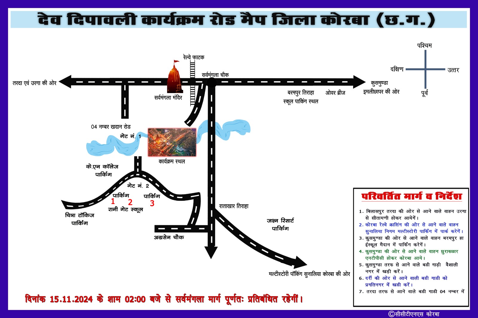 कोरबा (ट्रैक सिटी)/ देव दिवाली कार्यक्रम हसदेव महा आरती 2024 के लिए कोरबा पुलिस की ओर से हसदेव आरती में सम्मिलित होने हेतु श्रद्धालुओं एवं राहगीरों के लिए दिनांक 15/11/2024 दिन शुक्रवार को यातायात हेतु रूट डायवर्जन के साथ-साथ छोटी एवं बड़ी गाड़ियों के लिए पार्किंग व्यवस्था किया गया है जिसका रूट चार्ट भी विभाग की तरफ से जारी किया गया है।*