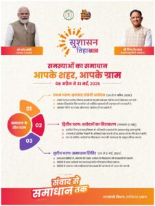 प्रदेश के मुख्यमंत्री विष्णुदेव साय के दिशा-निर्देश अनुसार प्रदेशभर में “सुशासन तिहार 2025” मनाया जाएगा। इस संबंध में 4 अप्रैल को जारी एक पत्र में बताया गया है कि इस आयोजन का उ‌द्देश्य आम जनता की समस्याओं का समयबद्ध निराकरण सुनिश्चित करना है। इसके साथ ही शासन की जन कल्याणकारी योजनाओं के क्रियान्वयन की समीक्षा करना तथा विकास कार्यों में गति लाना है। सुशासन तिहार के जरिए आम जनता, जनप्रतिनिधियों और विभिन्न सामाजिक संगठनों से सीधा संवाद स्थापित करने का भी उद्देश्य रखा गया है।
