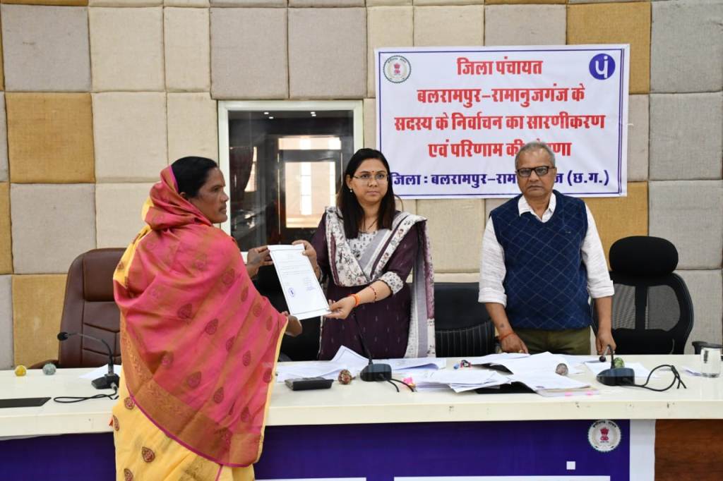 बलरामपुर/कोरबा (ट्रैक सिटी) त्रिस्तरीय पंचायत चुनाव के पहले चरण में जनपद पंचायत राजपुर, कुसमी एवं शंकरगढ़ में 17 फरवरी को मतदान संपन्न हुआ। जिसके तहत जिला पंचायत सदस्य हेतु हुए मतदान के लिए आज संयुक्त जिला कार्यालय भवन के सभाकक्ष में जिला पंचायत सीईओ व  रिटर्निंग अधिकारी श्रीमती नयनतारा सिंह तोमर की उपस्थिति में सारणीकरण एवं निर्वाचन परिणाम की घोषणा की गई। कलेक्टर एवं जिला निर्वाचन अधिकारी राजेन्द्र कटारा के निर्देशानुसार रिटर्निंग अधिकारी श्रीमती नयनतारा सिंह तोमर के द्वारा नव निर्वाचित जिला पंचायत सदस्यों को प्रमाण पत्र प्रदान किया गया।