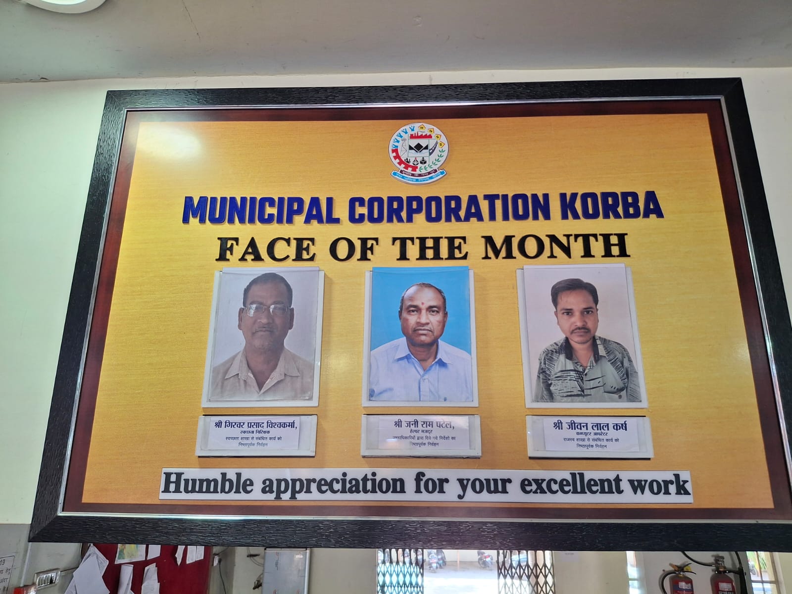 यहॉं उल्लेखनीय है कि आयुक्त श्री आशुतोष पाण्डेय की विशेष पहल पर उत्कृष्ट कार्य करने वाले तृतीय व चतुर्थ श्रेणी के कर्मचारियों को सम्मानित करने, उनका उत्साहवर्धन करने तथा अन्य कर्मचारियों को प्रेरणा देने की दिशा में अभिनव कदम उठाते हुए निगम का ’’ फेस आफ द मंथ ’’ चुने जाने का नवाचार निगम प्रशासन द्वारा किया जा रहा है। जनवरी 2025 से प्रारंभ की गई इस अभिनव पहल के तहत जनवरी माह के ’’ फेस आफ द मंथ ’’ के रूप में सफाई कर्मचारी बल गौरेया, भृत्य प्रमोद यादव, व आक्ट्राय पोस्ट सहायक दिलेश्वर सिंह ठाकुर का चयन किया गया था। इसी प्रकार फरवरी माह के लिए सहायक ग्रेड-2 श्यामकली डहरिया, सफाई कर्मचारी रामनरेश कलसे व कम्प्यूटर आपरेटर लक्ष्मण राव ’’ फेस आफ द मंथ ’’ चुने गए थे। मार्च माह के ’’ फेस आफ द मंथ ’’ के रूप में स्वच्छता निरीक्षक गिरवर प्रसाद विश्वकर्मा, भृत्य जनीराम पटेल व कम्प्यूटर आपरेटर जीवनलाल कर्ष का चयन किया गया है।