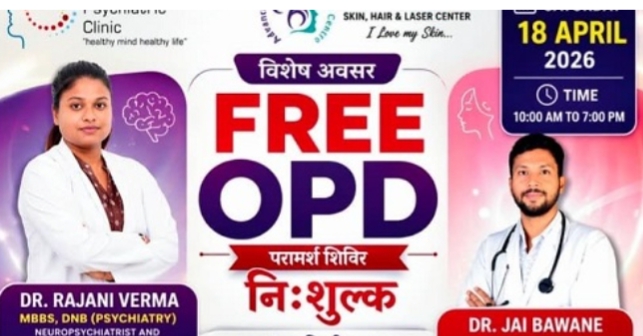 कोरबा (ट्रैक सिटी)। शहर के निहारिका क्षेत्र स्थित एडवांस्ड डायग्नोस्टिक सेंटर में शनिवार 18 अप्रैल को एक दिवसीय निशुल्क स्वास्थ्य परीक्षण शिविर का आयोजन किया जा रहा है। यह शिविर सुबह 10:00 बजे से शाम 7:00 बजे तक आयोजित होगा, जिसमें अहमदाबाद की प्रख्यात न्यूरो-साइकेट्रिक विशेषज्ञ डॉ. रजनी वर्मा एवं त्वचा रोग विशेषज्ञ एवं कॉस्मेटोलॉजिस्ट डॉ. जय बावने अपनी सेवाएं प्रदान करेंगे।