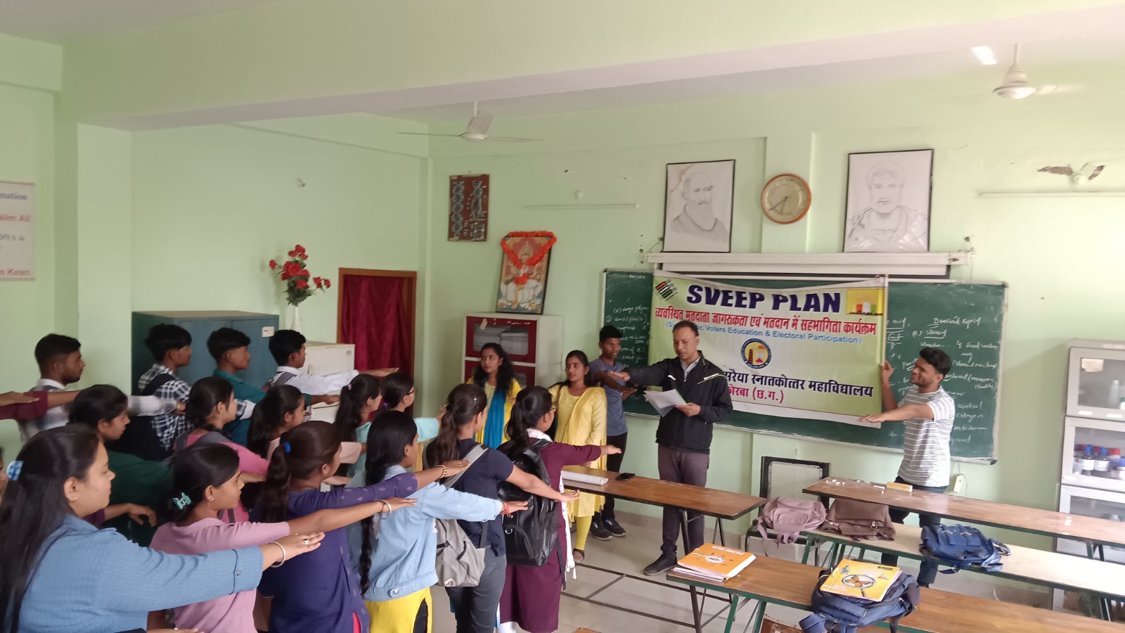 कोरबा (ट्रैक सिटी)/ कलेक्टर एवं जिला निर्वाचन अधिकारी अजीत वसंत के निर्देशन में नगरीय निकाय एवं त्रिस्तरीय पंचायतो के आम निर्वाचन के दौरान मतदान के प्रति आमजनों में जनजागरूकता लाने हेतु विविध गतिविधियों का आयोजन किया जा रहा है। इसी कड़ी में शासकीय ई.वी.पी.जी. महाविद्यालय में आगामी नगरीय निकाय चुनाव में छात्र-छात्राओ की शत प्रतिशत भागीदारी सुनिश्चित करने हेतु उन्हें शसक्त लोकतंत्र के निर्माण में मतदान के महत्व की जानकारी दी गई एवं अनिवार्य रूप से मतदान करने हेतु संकल्प दिलाया गया। महाविद्यालय के छात्र-छात्राओं ने निर्वाचन कार्य में किसी प्रकार के भय, लोभ, प्रलोभन में न आकर, जाति, वर्ग, धर्म, समुदाय से परे होकर मतदान करने का संकल्प लिया।