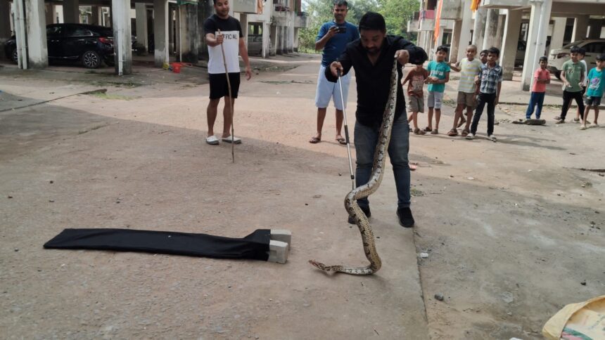 कोरबा (ट्रैक सिटी)/ कोरबा जिले के पुलिस लाईन में जब बच्चे खेल रहे थे तभी कुछ लोगों की नजर एक किनारे रखें लकड़ी के ढेर पर पड़ी तो देखा उसके अंदर छुप कर एक 7 फिट का अजगर बैठा था , बच्चों की सुरक्षा को ध्यान में रखते हुए उसको जंगल छोड़ना ज्यादा सही लगा उस उद्देश्य से सुरेश कुमार आरक्षक ने इसकी जानकारी वाइल्डलाइफ रेस्क्यु टीम अध्यक्ष जितेंद्र सारथी को दिया गया, जिसमें थोड़ी देर में पहुंचने की बात कही गई फिर कुछ देर बाद जितेंद्र सारथी पुलिस लाईन के नए बिल्डिंग पहुंचे फिर पहले बच्चों को उस जगह से दूर किया गया फिर रेस्क्यु ऑपरेशन चालू किया गया फिर बड़ी सावधानी से अजगर को सुरक्षित रेस्क्यु कर थैले में डाला गया, जिस वक्त अजगर का रेस्क्यु किया जा रहा था तो सभी अपने बालकनी से रेस्क्यु ऑपरेशन को बड़ी उत्सुकता से देख रहे थे, फिर अजगर को उसके प्राकृतिक रहवास जंगल में पुनः छोड़ा गया।