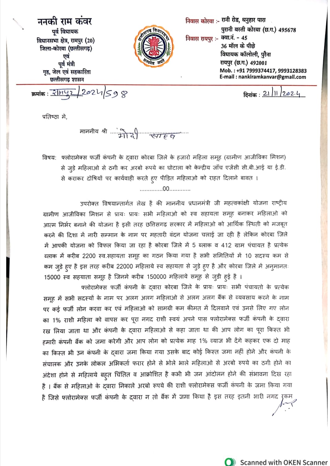 (ट्रैक सिटी)/ छत्तीसगढ़ के सबसे वरिष्ठ आदिवासी नेता पूर्व गृहमंत्री ननकीराम कंवर ने प्रधानमंत्री नरेंद्र मोदी व केंद्रीय गृह मंत्री अमित शाह सहित राज्य सरकार को पत्र लिखा है और फ्लोरमैक्स कंपनी के द्वारा हजारों महिला के साथ में अरबो रुपए की ठगी करने के संबंध में केंद्रीय जांच एजेंसी सीबीआई ई.डी व ईओडबलु से जांच करने की मांग की है।