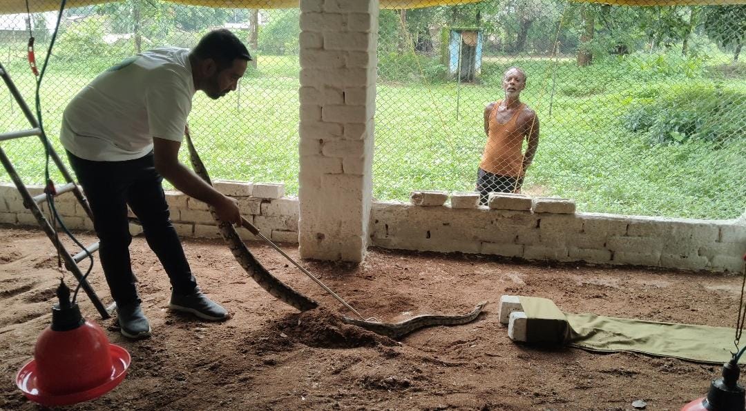 कोरबा/ट्रैक सिटी : – कोरबा जिले में लगातार ग्रामीण एवं शहरी क्षेत्रों में सांप निकलने की घटना सामने आ रही हैं, वहीं दो दिनों से लगातार बारिश होने के साथ साथ सांप निकलने की घटना भी लगातार जानकारी मिल रही हैं वहीं आज प्रातः सुबह 9 बजे के आस पास जगरहा बस्ती के एक पोल्ट्री फार्म में दो मुर्गी खाकर बैठे अजगर की जानकारी वाइल्डलाइफ रेस्क्यु टीम (नोवा नेचर) के जितेंद्र सारथी को मिली गया जिसके बाद इसकी जानकारी डीएफओ कुमार निशांत को दिया गया फिर उनके निर्देशानुसार एसडीओ सूर्यकांत सोनी के मार्गदर्शन में जितेंद्र सारथी घटना स्थल के लिए रवाना हो गए फिर वहां पहुंच कर दीवाल में कुंडली मार कर बैठे अजगर को नीचे लाया गया फिर सारथी ने प्रोटोकॉल और सुरक्षा का विशेष ध्यान में रखते हुए, पर्याप्त दूरी बना कर बड़ी सावधानी से 8 फीट के अगजर को थैले में रेस्क्यु कर के रखा और लोगों को बताया गया कि यह Indian Rock Python (अजगर) हैं जो की जहरीला नहीं होता पर अपने शिकार को कुंडली मार कर दम घोट कर मार सकता हैं इसलिए इनको पकड़ने या छेड़खानी करने की कोशिश न करें तब जाकर सभी ने राहत भरी सांस लिया साथ ही लोगों ने जितेंद्र सारथी का धन्यवाद् ज्ञापित किया फिर अजगर को सुरक्षित जंगल में छोड़ दिया गया।