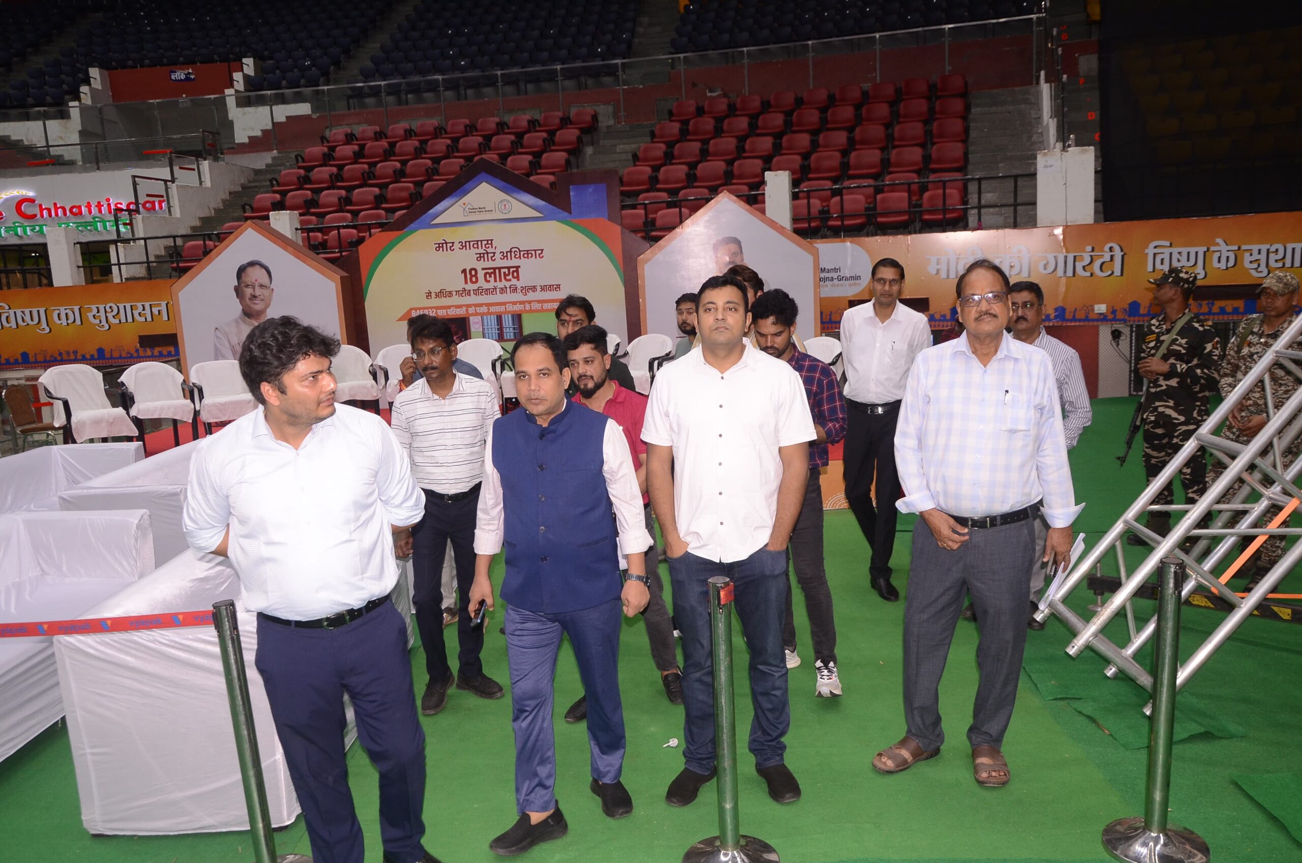 रायपुर (ट्रैक सिटी)। प्रधानमंत्री नरेंद्र मोदी प्रधानमंत्री आवास योजना ग्रामीण का शुभारंभ करेंगे। साथ ही हितग्राहियों के खाते में राशि अंतरित करेंगे। इस कार्यक्रम में मुख्यमंत्री विष्णुदेव साय सहित मंत्रीगण भी उपस्थित रहेंगे। रायपुर के बूढ़ापारा स्थित इंडोर स्टेडियम में कार्यक्रम स्थल का आज प्रधानमंत्री आवास योजना ग्रामीण के संचालक रजत बंसल एवं कलेक्टर डाॅ. गौरव सिंह ने कार्यक्रम स्थल का जायजा लिया। कार्यक्रम स्थल की व्यवस्थाओं को संचालक एवं कलेक्टर, एसएसपी संतोष सिंह ने देखा। इस अवसर पर एसएसपी संतोष सिंह, जिला पंचायत सीईओ विश्वदीप, अपर कलेक्टर देवेंद्र पटेल समेत अन्य अधिकारी व कर्मचारी उपस्थित थे।