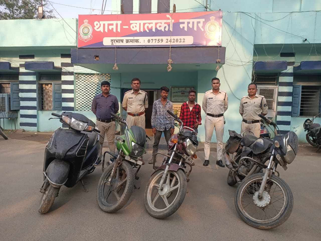 कोई अज्ञात चोर द्वारा उक्त मोटर सायकल को चोरी कर ले गया है। कि रिर्पोट पर अपराध सदर कायम कर विवचेना में लिया गया। घटना की गंभीरता को देखते हुए पुलिस अधीक्षक कोरबा सिद्धार्थ तिवारी के निर्देशन, अति. पुलिस अधीक्षक कोरबा यू.बी.एस चौहान एवं नगर पुलिस अधीक्षक कोरबा प्रतीमा मरकाम के मार्गदर्शन में थाना प्रभारी बालको अभिनवकांत सिंह के नेतृत्व में थाना बालकोनगर में चोरो की धर पकड हेतु विशेष टीम तैयार किया जिनके द्वारा दिनांक 15.05.2024 एवं 16.05.2024 के दरम्यानी रात पेट्रोलिंग गस्त दौरान उक्त चोरी गये मोटर सायाकल में एक व्यक्ति जिसने अपना नाम पूछने पर आकाश भिंगराज बताया मिला तथा उसके साथ साथ एक अन्य मोटर सायकल प्लेटिना में राकेश बघेल उर्फ रक्का नाम का लडका मिला जिने उक्त गाडियों के संबंध में पूछताछ करने पर संतुष्टि जनक जवाब नहीं दे सके तथा उक्त गाडियों के काजगात भी उनके पास नहीं थे, जो उक्त दोनों को तलब कर थाना लाया गया जिनसे प्रातः समय स्वतंत्र साक्षियों के समक्ष पूछताछ करने पर दोनों के द्वारा मिलकर 03 मोटर सायकल एवं 01 स्कूटी को अलग अलग तारिखों में अलग अलग स्थान से चोरी करना बताये जिनके पास से 03 मो.सा. एवं 01 स्कूटी बरामद किया गया एवं दोनो आरोपीयों को न्यायिक रिमाण्ड पर भेजा गया है।
