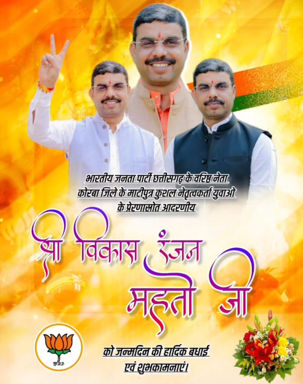 कोरबा (ट्रैक सिटी) भारतीय जनता पार्टी के वरिष्ठ नेता एवं युवाओं के चहेते चेहरे विकास महतो का जन्मदिन आज पूरे कोरबा जिले में धूमधाम और उत्साह के साथ मनाया गया। सुबह से ही जगह-जगह बधाई देने वालों का तांता लगा रहा। समर्थकों और कार्यकर्ताओं ने बैनर, होर्डिंग और पोस्टर के माध्यम से शुभकामनाएं दीं, जिससे पूरा शहर उत्सवमय नजर आया।