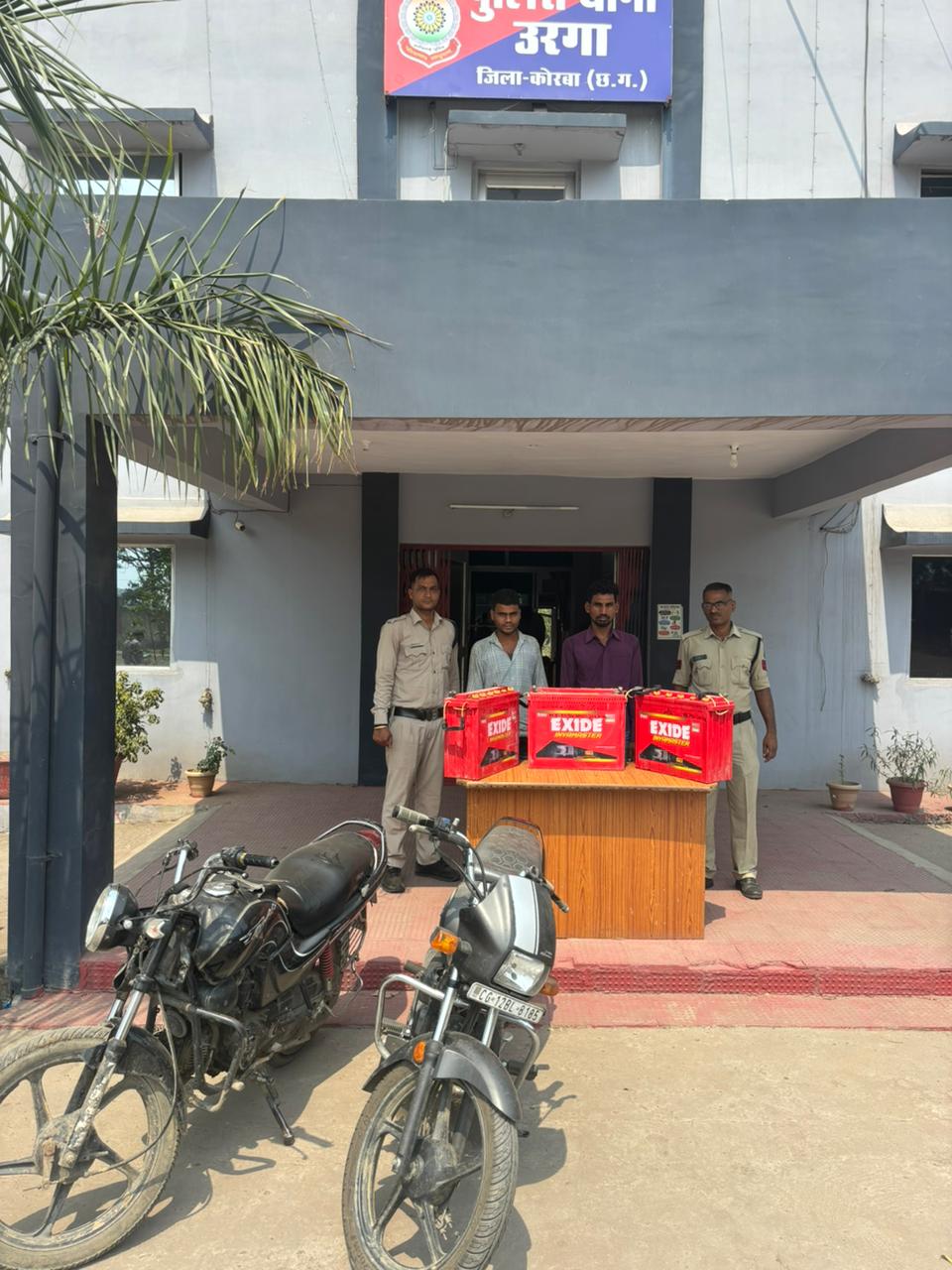जिसकी सूचना प्रहरी कन्हैया द्वारा दी गयी। रिपोर्ट पर अपराध धारा सदर कायम कर विवेचना में लिया गया। कोरबा जिला पुलिस अधीक्षक सिद्धार्थ तिवारी के द्वारा निर्देशित करने पर अतिरिक्त पुलिस अधीक्षक यु.बी.एस. चौहान, अतिरिक्त पुलिस अधीक्षक श्रीमती नेहा वर्मा व नगर पुलिस अधीक्षक कोरबा श्रीमती प्रतिभा मरकाम के मार्गदर्शन पर अज्ञात आरोपी व चोरी गए मशरूका का पतासाजी में लिया गया। पतासाजी के दौरान मुखबिर सूचना मिली की तरदा होटल में 04 लड़के पुरानी बैटरी बेचने के संबंध में आपस में चर्चा कर रहे है कि संदेह के आधार पर ग्राम तरदा जाकर होटल में चारो लड़को को शंका के आधार पर नाम पता पूछकर थाना लाये। उसके बाद पृथक-पृथक पूछताछ कर मेमोरेंडम कथन लिया गया, जो अपने-अपने कथन में उनके द्वारा बताया गया कि घटना समय रात्रि चारो लोग दो वाहन में बैठकर चोरी करने के लिए भारत माला निर्माणाधीन रोड़ रिलेक्स इन होटल के आगे गए और सोलर लाईट सिस्टम में लगे 03 नग एक्साईड को निकाले। फिर उसे वाहन में लोड करके छुपाकर रख दिया तथा चोरी में उपयोग किये वाहन को अपने-अपने घर में रखना कबुल किये। मेमोरेण्डम कथन बाद हमराह स्टॉप एवं गवाहान के संदेहियों को साथ लेकर बताए स्थान में जाकर मुताबिक जप्ती पत्रक के तीन नग बैटरी तथा 02 वाहन को मुताबिक जप्ती पत्रक के आरोपीगणों के पेश करने पर जप्त कर कब्जा पुलिस लिया गया।