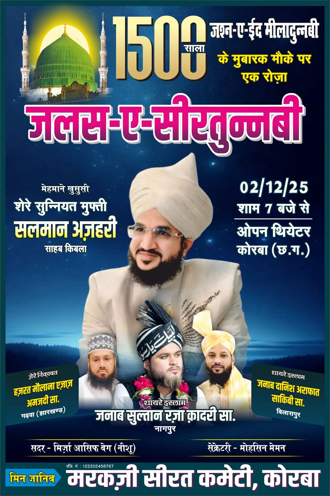 कोरबा(ट्रैक सिटी)/ मरकजी सीरत कमेटी कोरबा द्वारा 1500 साला जश्ने ईद मिलादुन्नबी मनाने हेतु 1 दिवसीय जलसा (धार्मिक प्रवचन) जलस-ए-सीरतुन्नबी का आयोजन दिनांक 2 दिसंबर 2025, मंगलवार को ओपन थिएटर, घंटाघर चौक निहारिका कोरबा में किया जा रहा है.