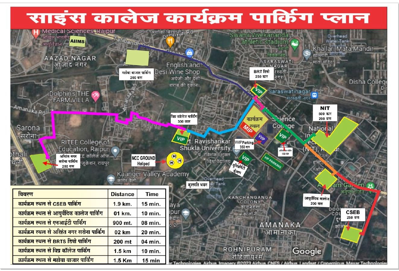 महासमुंद, धमतरी एवं बस्तर की ओर से कार्यक्रम में आने वाले वाहन पचपेड़ीनाका चौक-रिंग रोड-1-सरोना चौक से कांगेर वैली स्कूल की ओर से यूनिवर्सिटी ग्राउंड में वाहन पार्क करेंगे।