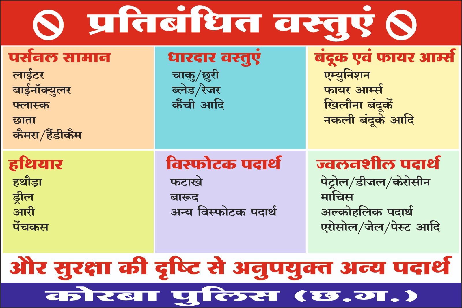 माननीय मुख्यमंत्री छत्तीसगढ़ शासन के आगमन पर कोरबा पुलिस ने जारी किया एडवाइज़री एवं प्रतिबंधित सामग्री की सूची।