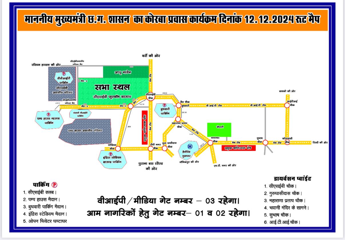 माननीय मुख्यमंत्री छत्तीसगढ़ शासन के आगमन पर कोरबा पुलिस ने जारी किया यातायात रूट मैप और पार्किंग व्यवस्था प्लान।