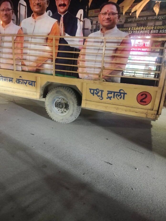 राज्योत्सव की तैयारी के बीच नगर पालिका निगम कोरबा द्वारा पशु ट्रॉली में मुख्यमंत्री समेत अन्य लोगों के फ्लेक्स को ले जाना अब चर्चा का विषय बन गया हैं।यह फोटो सोशल मीडिया में वायरल हो रहा है, और लोग नगर निगम की लापरवाही पर जमकर मजे ले रहे हैं, शहरवासियों ने निगम प्रशासन की इस कार्यप्रणाली पर कड़ी नाराजगी जताई है।