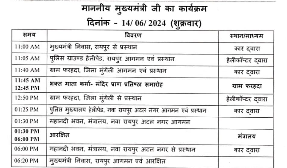 मुंगेली (ट्रैक सिटी)/ मुख्यमंत्री विष्णुदेव साय मुंगेली विकासखंड के ग्राम फरहदा में 14 जून को भक्त माता कर्मा मंदिर प्राण प्रतिष्ठा समारोह में शामिल होंगे। निर्धारित दौरा कार्यक्रम के अनुसार मुख्यमंत्री साय 14 जून को प्रातः 11.05 बजे रायपुर से हेलीकाप्टर द्वारा प्रस्थान कर प्रातः 11.40 बजे ग्राम फरहदा पहुंचेंगे और प्रातः 11.45 बजे से दोपहर 12.45 बजे तक भक्त माता कर्मा मंदिर प्राण प्रतिष्ठा समारोह में शामिल होंगे। इसके पश्चात मुख्यमंत्री साय दोपहर 12.50 बजे फरहदा से रायपुर के लिए प्रस्थान करेंगे।