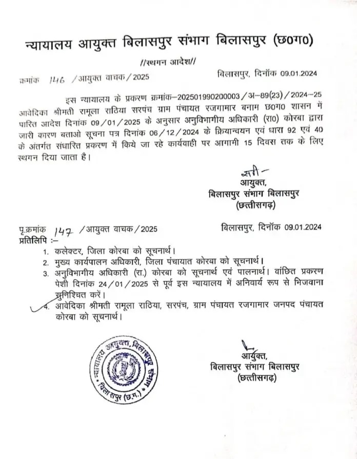 रजगामार क्षेत्र महिला सरपंच के विरुद्ध धारा 92 व 40 की कार्यवाही पर कमिश्नर बिलासपुर ने दिया स्थगन आदेश