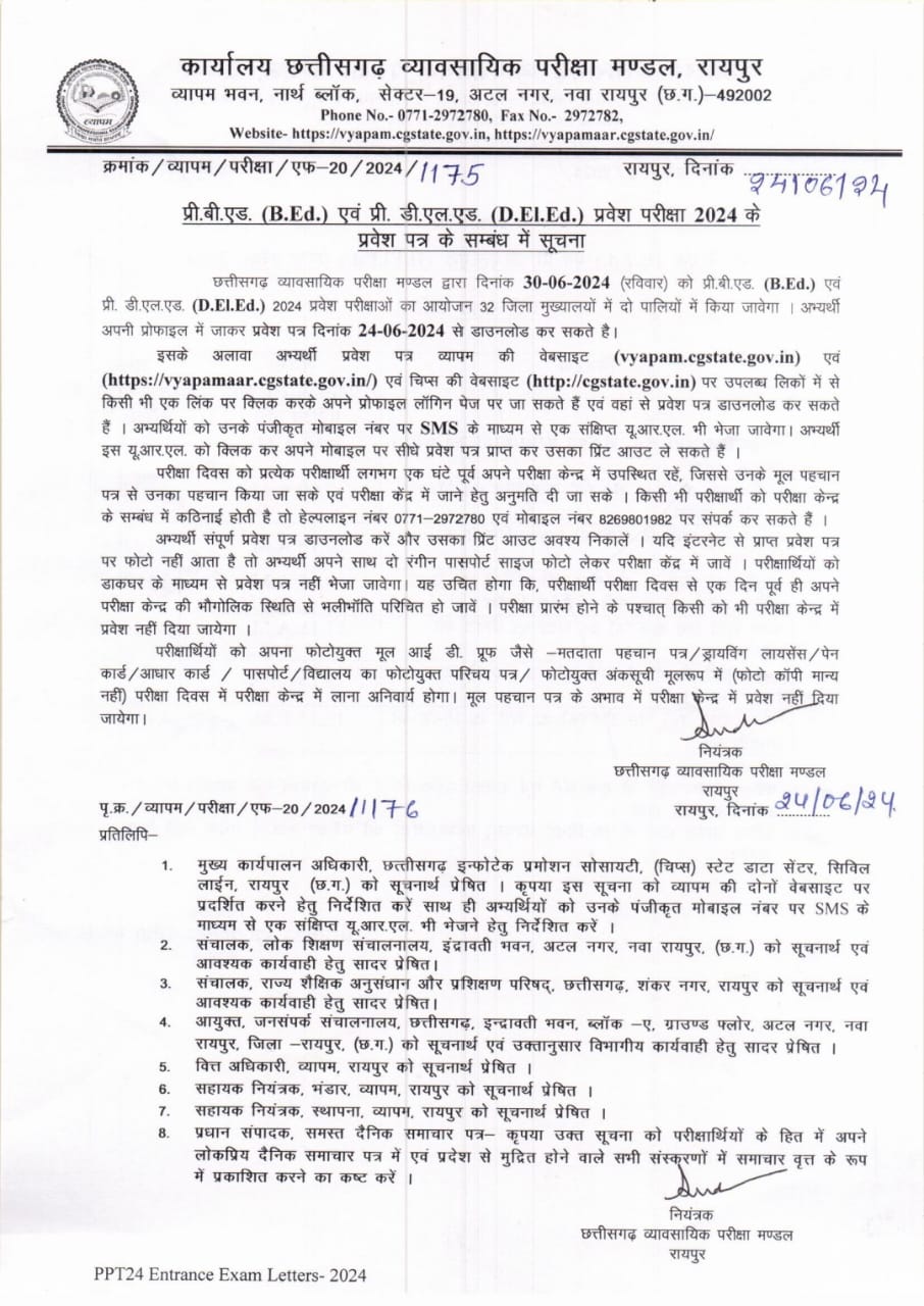 सारंगढ़ बिलाईगढ़ (ट्रैक सिटी)/ सीजी व्यापमं द्वारा सारंगढ़ जिला मुख्यालय को प्रीबीएड और प्रीडीएलएड परीक्षा का परीक्षा केन्द्र बनाया गया है, जिसका परीक्षा दो पालियों में 30 जून 2024 रविवार को संपन्न होगा। व्यापमं की वेबसाईट व्यापम डॉट सीजीस्टेट डॉट जीओव्ही डॉट इन से प्रवेश पत्र डाउनलोड किया जा सकता है। परीक्षा दिवस को प्रत्येक परीक्षार्थी लगभग एक घंटे पूर्व अपने परीक्षा केन्द्र में उपस्थित रहें। जिससे उनके मूल पहचान पत्र से उनका पहचान किया जा सके एवं परीक्षा केंद्र में जाने हेतु अनुमति दी जा सके। परीक्षा प्रारंभ होने के पश्चात् किसी को भी परीक्षा केन्द्र में प्रवेश नहीं दिया जायेगा।