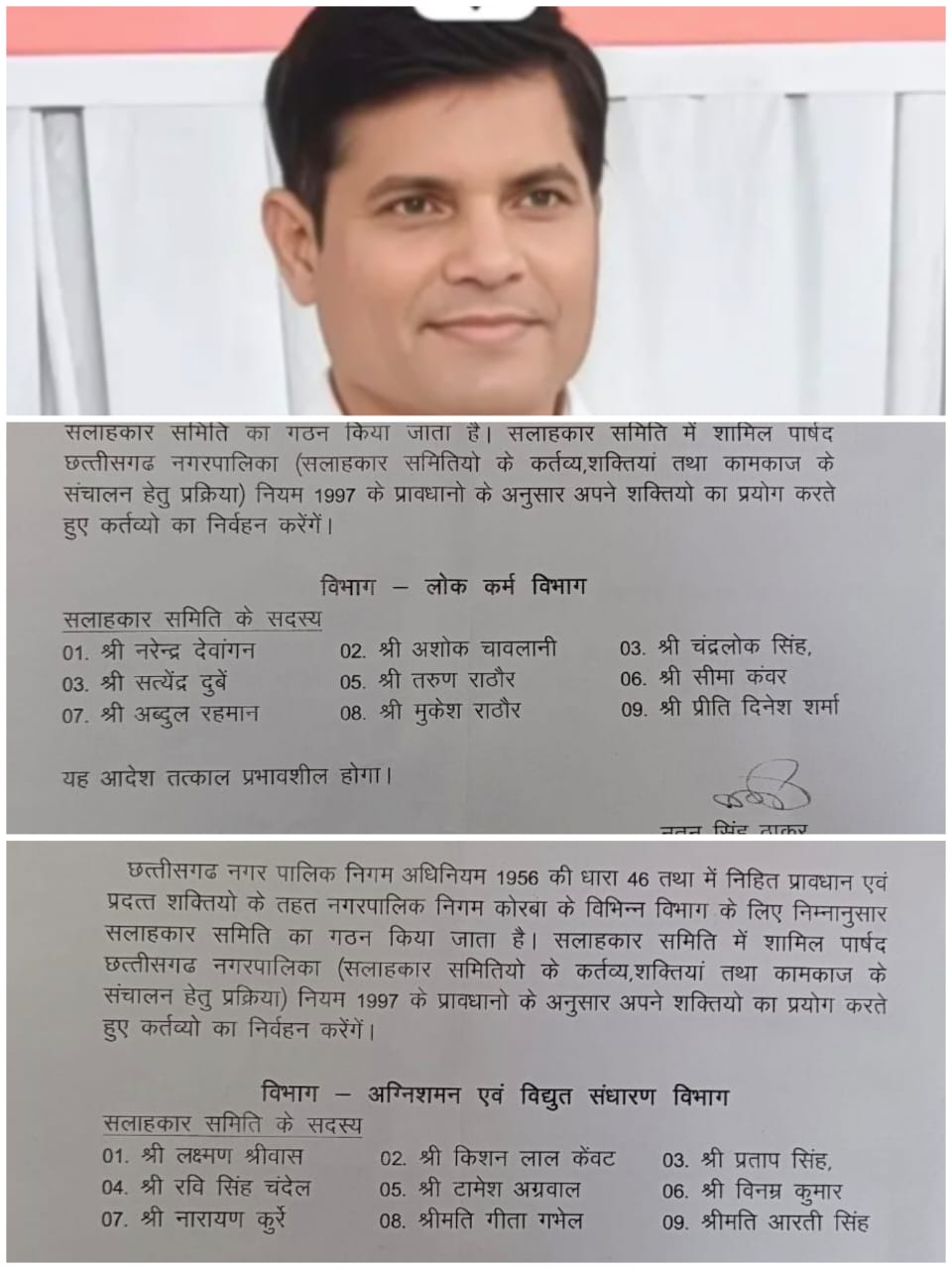 छत्तीसगढ़ नगर पालिक निगम कोरबा के प्रावधान के अनुसार नगर पालिक निगम अध्यक्ष व सभापति नूतनसिंह ठाकुर ने आज 02 विभागों में सलाहकार समिति के गठन किया है।