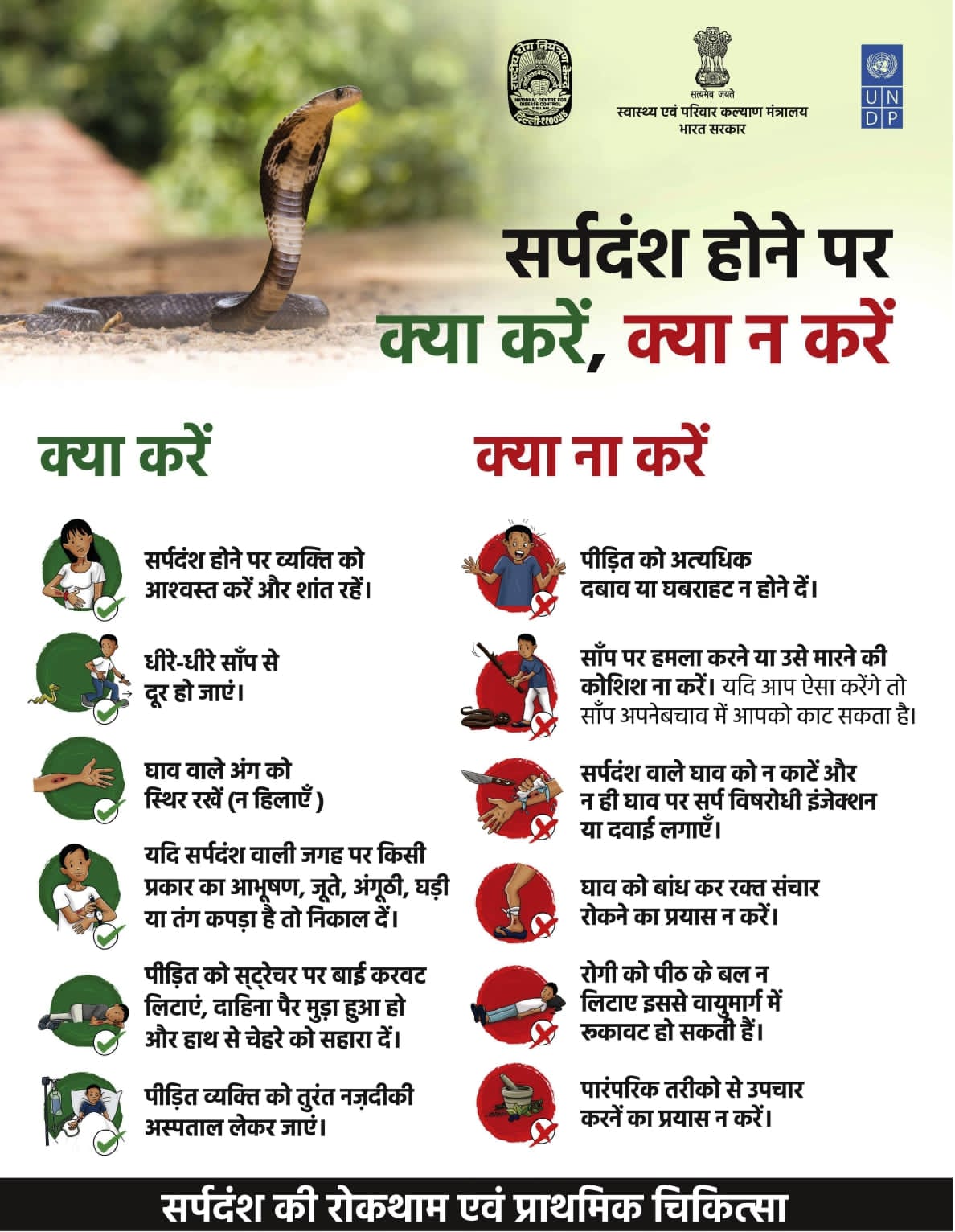 सर्पदंश के उपचार हेतु एंटीस्नेक वेनम का पर्याप्त डोज़ जिला अस्पताल सहित सभी प्राथमिक एवं सामुदायिक स्वास्थ्य केन्द्रों में उपलब्ध है। अतः बिना देर किये नजदीकी स्वास्थ्य केन्द्र में पहुॅचकर उपचार कराना चाहिए। सर्पदंश पीडित को सही समय में ईलाज मिलने से उसकी जान बचाई जा सकती है। ग्रामीण क्षेत्र के लोग अक्सर जमीन पर सोते है और खेतों जंगलो में काम करने जाते है, जिससे उनकी सर्पदंश होने की संभावना बढ़ जाती है। अतः सोते समय चारपाई और केमिकल युक्त मच्छरदानी का उपयोग करने, घरों के आसपास सफाई रखने और अंधेरे स्थानों में जाने के लिऐ टार्च का उपयोग करने तथा खेतों में काम करने के दौरान घुटने तक वाले जुते पहनने की सलाह दी गई है।