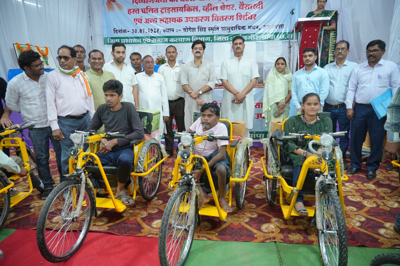 कार्यक्रम के मुख्य अतिथि विधायक अकलतरा राघवेन्द्र कुमार सिंह ने दिव्यांगजनों को शुभकामनाएं देते हुए कहा गया कि ‘‘दिव्यांगजनों के लिए संचालित योजनाओं की जानकारी एवं हितलाभ अंतिम क्षेत्र में निवासरत दिव्यांगजनों तक पहुचनी चाहिए तथा संचालित योजनाओं का अधिक से अधिक प्रचार-प्रसार होनी चाहिए। कार्यक्रम की अध्यक्षता करते हुए पूर्व विधायक श्री सौरभ सिंह अपने उद्बोधन में कहा की समस्त पात्र दिव्यांगजनों को उनके आवश्यकता के अनुरूप मोटराईज्ड ट्रायसायकिल, हस्त चलित ट्रायसायकिल एवं अन्य सहायक उपकरण का लाभ दिया जाना सुनिश्चित किया जावे। उक्त शिविर 14 मोटराईज्ड ट्रायसायकिल, 08 हस्त चलित ट्रायसायकिल, 01 व्हील चेयर, 02 जोड़ी बैशाखी, एवं 01 श्रवण यंत्र दिव्यांगजनों को अतिथियों द्वारा वितरण किया गया, आवश्यकता अनुरूप सामाग्रियां प्राप्त कर दिव्यांगजनों द्वारा हर्ष व्यक्त करते हुए समाज कल्याण विभाग के प्रति अभार व्यक्त किया गया। इस अवसर पर नगर पालिका अध्यक्ष श्रीमती शांति भारते, जिला पंचायत सभापति धरमलाल भारद्धाज, जिला पंचायत सदस्य दिलेश्वर साहू, जनपद पंचायत अकलतरा सदस्य श्यामलाल बर्मन, दिगम्बर साहू, पूर्व नगर पालिका अध्यक्ष खुलन सोनवानी, उमाकांत भारते, ग्राम मुड़पार सरपंच प्रतिनिधि श्री संतोष यादव, एसडीएम विक्रांत अंचल, जनपद पंचायत अकलतरा सीईओ प्रशांत गुप्ता सहित जनप्रतिनिधि, संबंधित अधिकारी कर्मचारी एवं गणमान्य नागरिक बड़ी संख्या उपस्थित थे।