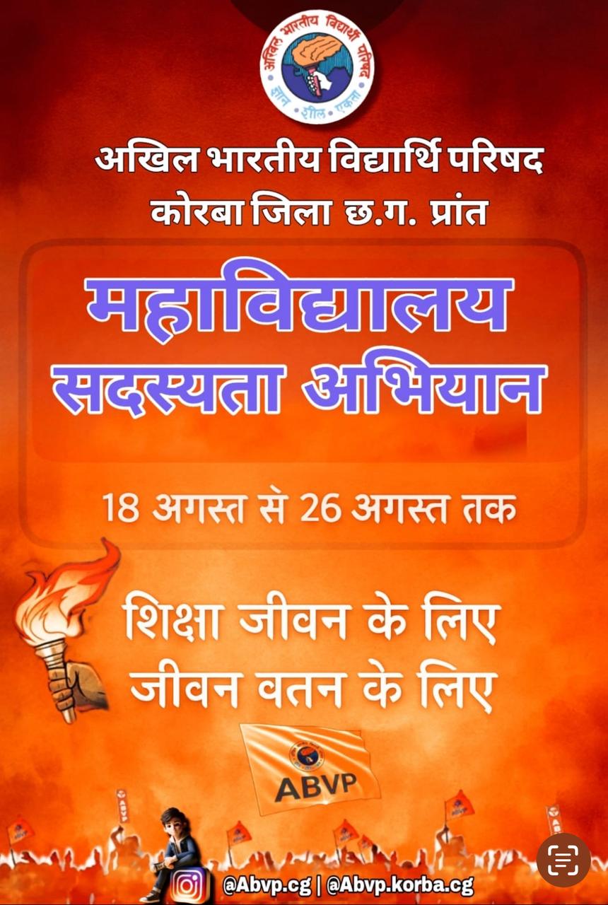 कोरबा (ट्रैक सिटी) अखिल भारतीय विद्यार्थी परिषद कोरबा इकाई की ओर से 18 से 26 अगस्त तक सदस्यता अभियान चलाया जाएगा । इस अभियान का उद्देश्य छात्रों को छात्रहित व राष्ट्रीय हित सेवा कार्य से जोड़ने का है। अखिल भारतीय विद्यार्थी परिषद के जिला संयोजक निहाल सोनी ने बताया कि सदस्यता अभियान जिले के हर कॉलेज में चलाया जाएगा। परिषद ने सभी विद्यार्थियों से अपील की है कि वह इस अभियान में शामिल होकर संगठन का हिस्सा बने और समाज व राष्ट्र निर्माण की प्रक्रिया में अपनी भूमिका निभाएं।