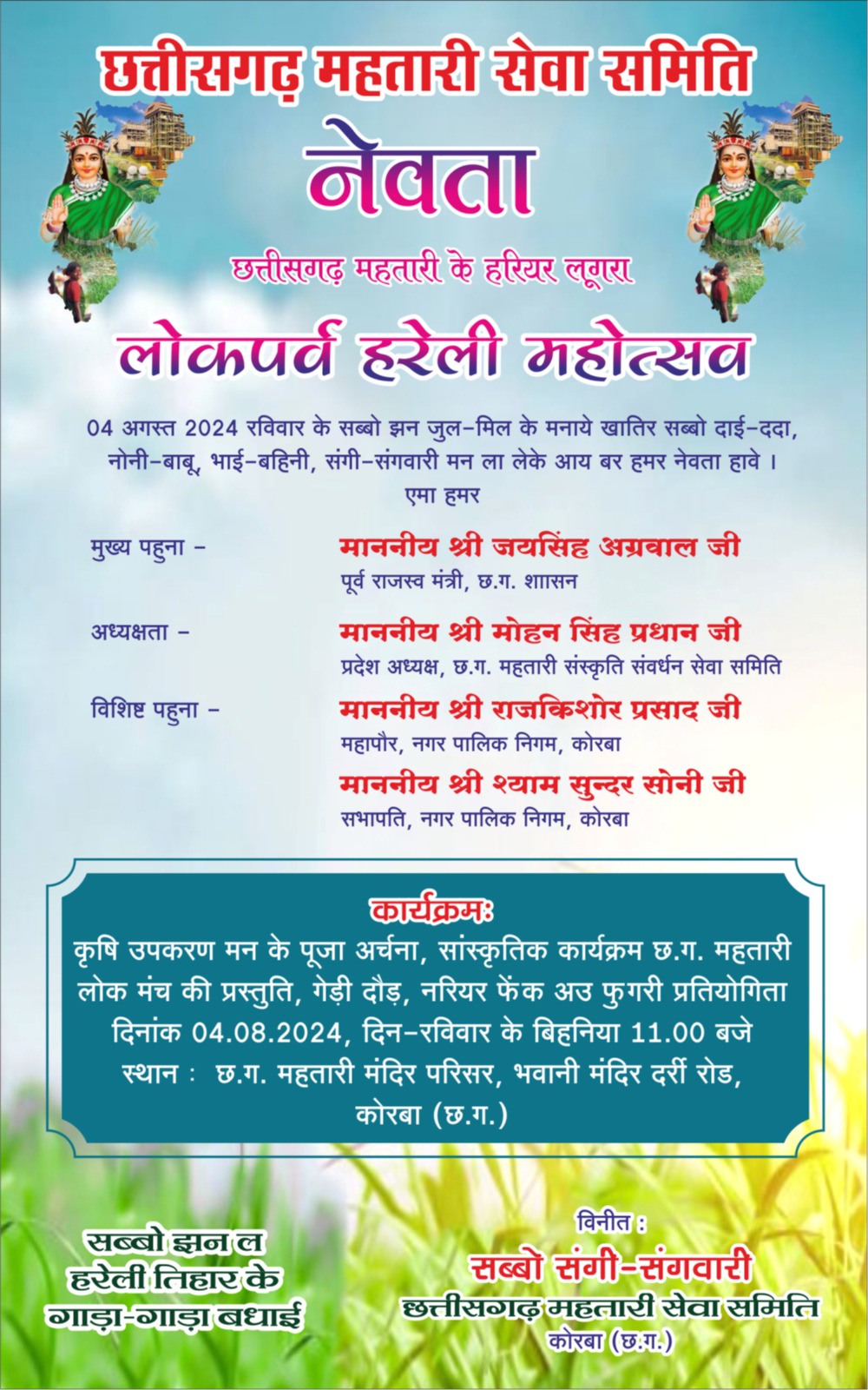 कार्यक्रम 4 अगस्त को प्रातः 10:30 बजे छत्तीसगढ़ महतारी मां एवं कृषि उपकरणों का पूजा अर्चना कर शुभारंभ की जावेगी।