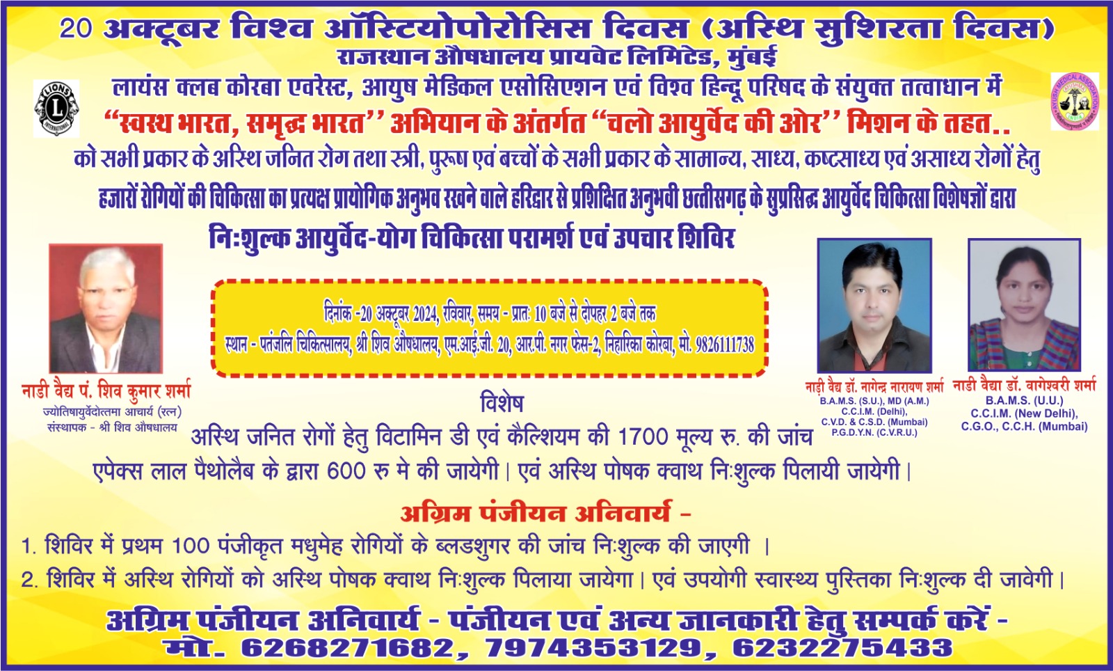 कोरबा (ट्रैक सिटी) 20 अक्टूबर वर्ल्ड ऑस्टियोपोरोसिस डे (विश्व अस्थिसुषिरता दिवस) पर स्वस्थ भारत समृद्ध भारत अभियान के अंतर्गत चलो आयुर्वेद की ओर मिशन के तहत लायंस क्लब कोरबा एवरेस्ट, विश्व हिंदू परीषद एवं आयुष मेडिकल एसोसिएशन के संयुक्त तत्वाधान में सभी प्रकार के अस्थिगत वात रोगों हेतु विटामिन डी, कैल्शियम जांच, रक्त शर्करा जांच एवं आयुर्वेद-योग चिकित्सा परामर्श एवं उपचार शिविर का आयोजन दिनांक 20 अक्टूबर 2024 रविवार को श्री शिव औषधालय एमआईजी 20 आर.पी.नगर फेस 2 शिवाजी नगर रोड निहारिका कोरबा में प्रातः 10 बजे से मध्यान्ह 2 बजे तक किया गया है। जिसमें अंचल के सुप्रसिद्ध अनुभवी आयुर्वेद चिकित्सा विशेषज्ञ श्री शिव औषधालय के संस्थापक नाड़ीवैद्य पंडित शिव कुमार शर्मा चिकित्सक द्वय नाड़ीवैद्या डॉ.वागेश्वरी शर्मा एवं नाड़ीवैद्य डॉ.नागेंद्र नारायण शर्मा विशेष रूप से अपनी चिकित्सकीय सेवाएं प्रदान करेंगे। शिविर में विशेष रूप से अपनी चिकित्सकीय सेवायें प्रदान करने वाले छत्तीसगढ़ के सुप्रसिद्ध अनुभवी आयुर्वेद चिकित्सा विशेषज्ञ नाड़ीवैद्य डॉ.नागेंद्र नारायण शर्मा ने शिविर के विषय में बताते हुये कहा की प्रत्येक वर्ष 20 अक्टूबर को वर्ल्ड ऑस्टियोपोरोसिस डे (विश्व अस्थि सुशिरता दिवस) मनाया जाता हैं जिसका उद्देश्य लोगो को आस्टीयोपोरोसिस (अस्थि सुशिरता) रोग के प्रति जागरूक करना है ताकि इस बीमारी से बचा जा सके।इसी तारतम्य में आयुष मेडिकल एसोसिएशन, लायंस क्लब कोरबा एवरेस्ट एवं विश्व हिंदू परिषद के संयुक्त तत्वाधान में सभी प्रकार के अस्थिगत वात रोगों हेतु विटामिन डी, कैल्शियम जांच, रक्त शर्करा जांच एवं आयुर्वेद-योग चिकित्सा परामर्श एवं उपचार शिविर का आयोजन किया जा रहा है। डॉ.नागेंद्र शर्मा ने बताया की ऑस्टियोपोरोसिस (अस्थिसुषिरता) रोग का एक बड़ा कारण कैल्शियम एवं विटामिन डी की कमी होना भी है। जिसके लिये शिविर में विटामिन डी एवं कैल्शियम की संयुक्त 1700 मूल्य की जांच रियायत मूल्य 600 रुपये में अपेक्स लाल पैथो लैब द्वारा की जायेगी। साथ ही आस्टीयोपोरोसिस तथा समस्त प्रकार के अस्थिगत वात रोगों के लिये उपयोगी अस्थि पोषक क्वाथ निशुल्क पिलाया जायेगा। तथा आस्टीयोपोरोसिस तथा समस्त प्रकार के अस्थिगत वात रोगियों के लिये उपयोगी स्वास्थ्य पुस्तिका भी निशुल्क दी जायेगी। साथ ही शिविर मे रक्त शर्करा (ब्लड शुगर) की जांच निशुल्क कर शुगर की परीक्षित औषधि निशुल्क देने के साथ-साथ शिविर में आये रोगियों की निःशुल्क जांच एवं परामर्श के साथ उनके लिये उपयोगी योगाभ्यास तथा प्राणायाम का व्यक्तिगत रूप से अभ्यास कराकर विशेष प्रायोगिक प्रशिक्षण भी दिया जाएगा। साथ ही आस्टीयोपोरोसिस (अस्थि सुशिरता) के रोगि