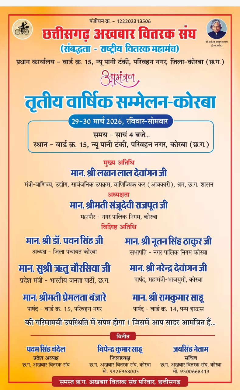 कोरबा (ट्रैक सिटी) छत्तीसगढ़ अखबार वितरक संघ द्वारा कोरबा में तृतीय वार्षिक सम्मेलन का आयोजन 29 एवं 30 मार्च को किया जाएगा। यह दो दिवसीय सम्मेलन परिवहन नगर स्थित वार्ड क्रमांक 15, न्यू पानी टंकी परिसर में आयोजित होगा। कार्यक्रम का शुभारंभ प्रतिदिन सायं 4 बजे से किया जाएगा, जिसमें जिले सहित प्रदेश भर के वितरक एवं पदाधिकारी शामिल होंगे।