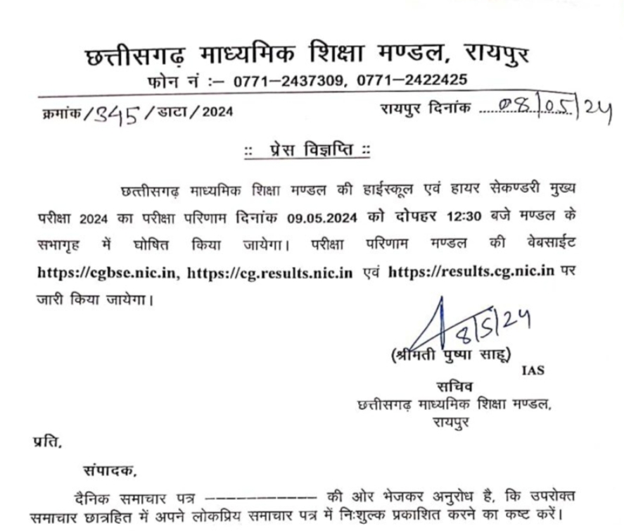 रायपुर (ट्रैक सिटी)/ छत्तीसगढ़ माध्यमिक शिक्षा मंडल के बोर्ड परीक्षा के परिणाम गुरुवार को राजधानी में जारी किया जाएगा । जिसमे 10 वीं 12 वीं बोर्ड परीक्षा के परिणाम एक साथ जारी होंगे ।