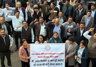 डॉक्टर पर हमले के विरोध में कोल माइंस ऑफिसर्स एसोसिएशन गेवरा के अधिकारियों का प्रदर्शन, महाप्रबंधक कार्यालय में बांधा काला फीता।