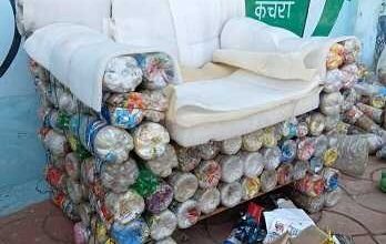 एस.एल.आर.एम, केंद्र की स्वच्छता दीदियों द्वारा डिस्पोजल व प्लास्टिक की बोतलों से बनाया खूबसूरत सोफा।