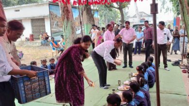 कलेक्टर ने न्योता भोज में शामिल होकर बच्चों को परोसा भोजन।